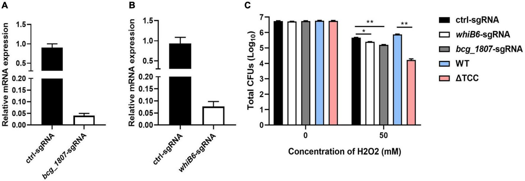 Figure 4. Knockdown of TCC-regulated genes decreased the resistance of BCG to hydrogen peroxide. (A,B) Using CRISPRi to target gene silence. Bacteria was collected at logarithmic phase in the presence of ATc. Gene knockdown was quantified by qRT-PCR (n = 3 biological replicates per each group, data are shown as the mean ± SEM). (C) Testing the survivability of knockdown strain. After induction, these knockdown strains were treated with 50 mM hydrogen peroxide. Bacteria strains were serially diluted 10-fold and spotted on 7H10-OADC agar. CFUs of M. bovis BCG were counted after 4 weeks days of incubation at 37°C (n = 3 biological replicates per group, data are shown as the mean ± SEM by unpaired t-test with two tailed p-value; *p < 0.05, **p < 0.01).
