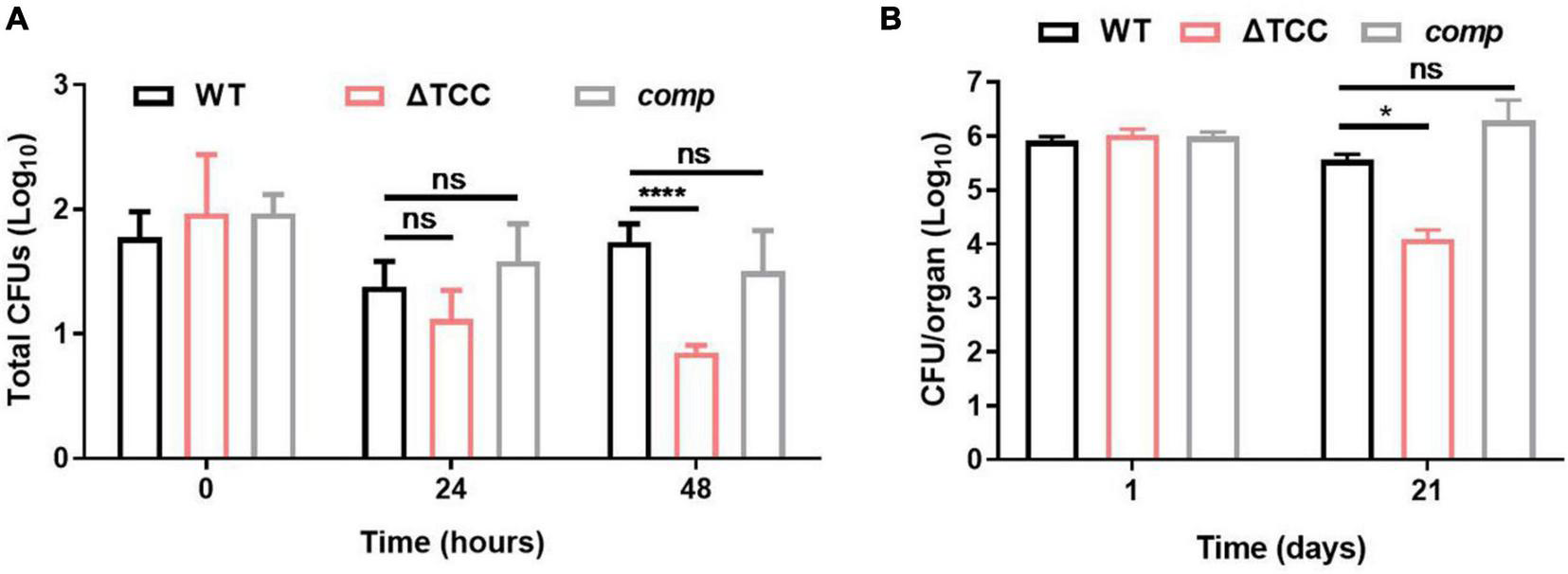 Figure 5. Evaluation intracellular fitness of ΔTCC mutant strain in vivo and in vitro. (A) RAW264.7 cells were seeded at 3 × 105 cells per well in 24-well culture plates. After adhesion, cells were infected with bacteria at MOI of 10. The extracellular bacteria were removed 2 h post infection by washing with PBS. The cells of M. bovis BCG were further incubated for 24 and 48h at 37°C. Then serially diluted (10-fold) cells lysates were spotted on a 7H10-OADC agar and cultured in 37°C. CFUs were counted after incubation for the indicated time (n = 3 biological replicates per group, data are shown as the mean ± SEM, two-way ANOVA with Tukey’s multiple comparison test, compared with WT group; ns, not significant, ****p < 0.0001). (B) Mice were infected i.p. (1 × 107) with WT, ΔTCC, or comp strains of M. bovis BCG. The number of surviving bacilli by CFU counting at the indicated time (n = 4 biological replicates per group, data are shown as the mean ± SEM, two-way ANOVA with Tukey’s multiple comparison test, compared with WT group; ns, not significant, *p < 0.05).