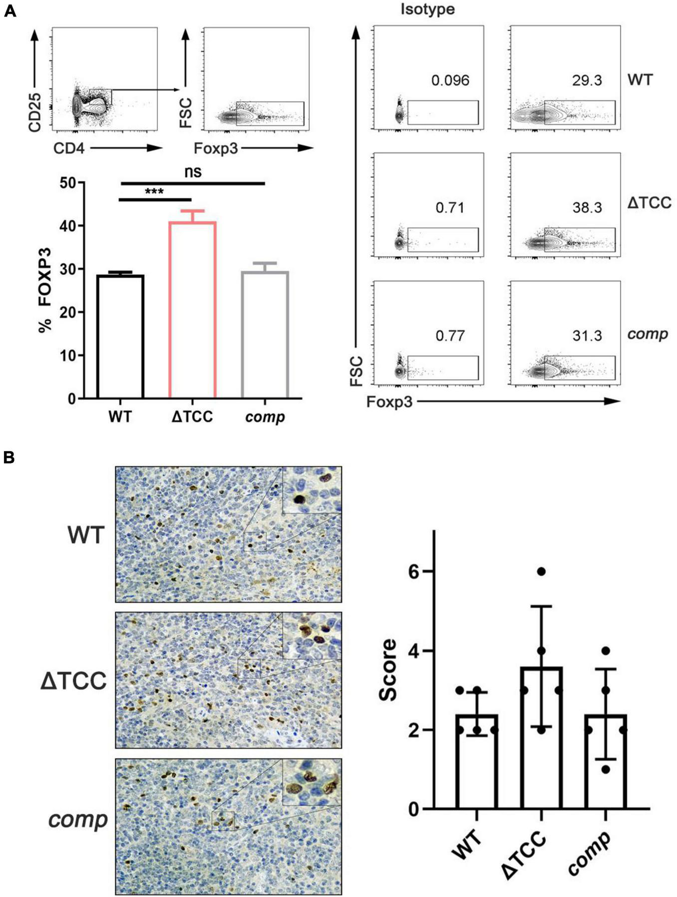Figure 6. TCC is required for inhibition of regulatory T cells. (A) Flow cytometry evaluation of CD4+ CD25+ FOXP3+ cells in spleens from mycobacteria-infected mice. FOXP3+ cells were determined by intracellular staining with anti-FOXP3 after surface staining with anti-CD4 and anti-CD25+. Cells were stained with FOXP3 as a marker for regulatory T cells. Isotypic antibodies were used as controls. The proportion of FoxP3+ T cells within total CD4+ CD25+ T cells was significantly higher in ΔTCC compared to WT (n = 3 biological replicates per each group, data are shown as the mean ± SEM, one-way ANOVA with Dunnett’s multiple comparison test performed for ΔTCC, compared with WT group; ns, not significant, ***p < 0.001). (B) Immunohistochemical evaluation of FOXP3+ cells in mice spleens. 400× magnifications, respectively. Similar results were observed in all spleens evaluated (n = 5). Bar = 200 μm. Specimens were scored according to the intensity of the dye color and the number of positive cells.