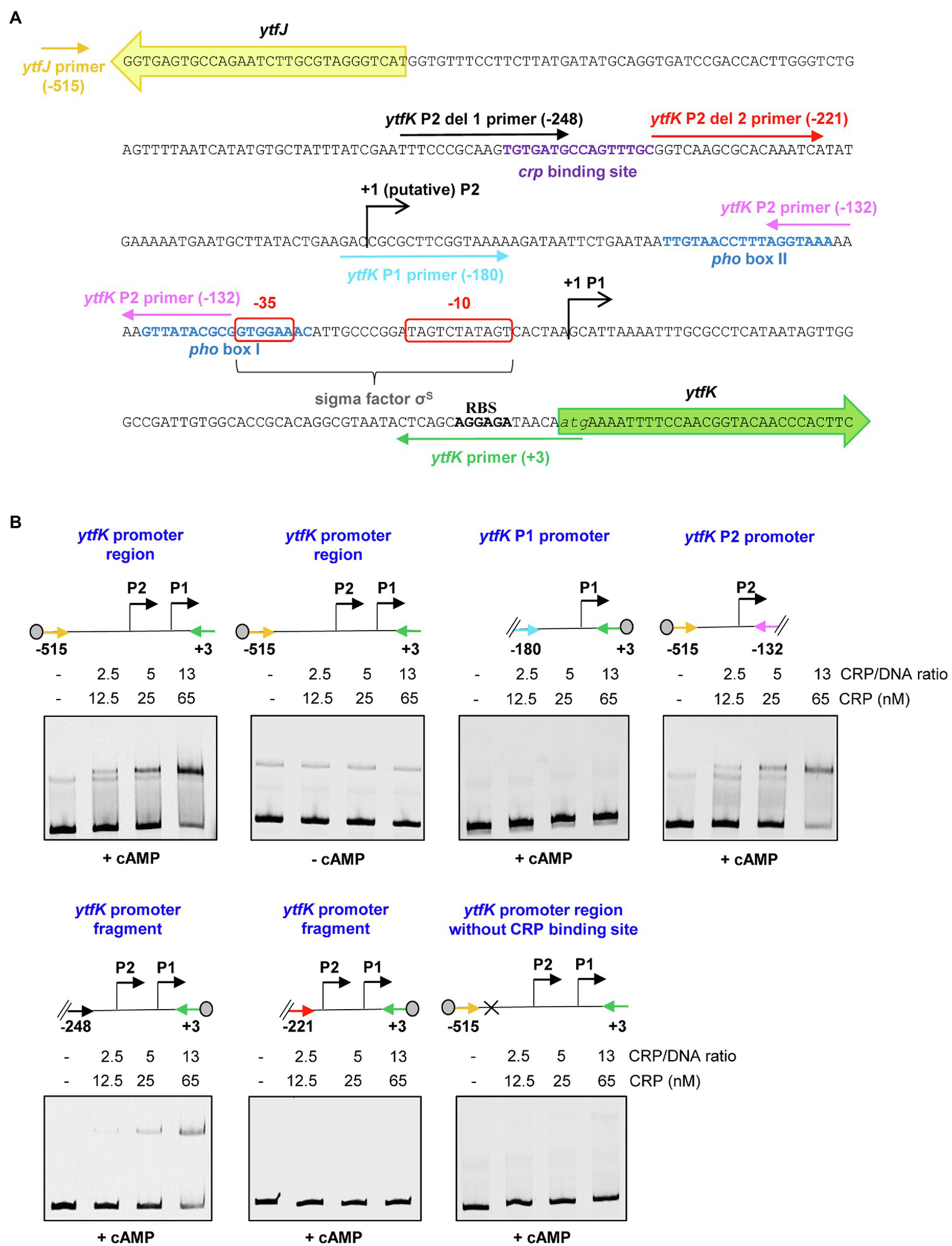 The cAMP-CRP complex forms a tight complex with the ytfK P2 promoter. (A) Intergenic sequence encompassing the ytfK promoter region. The coding sequences of ytfK and ytfJ are shown by green and yellow arrows, respectively. The −35 and−10 sequences of the P1 promoter are similar to the consensus sequences recognized by the sigma factor σS (Lacour and Landini, 2004; Salgado et al., 2013) and are boxed as red. The pho boxes (I and II) and the putative CRP-binding site are written in blue and purple, respectively. The transcriptional start sites of the P1 and putative P2 promoters are indicated by black arrows. The putative ribosome-binding site (RBS) located upstream of the ytfK coding sequence and its start codon is indicated in bold and in italic letters, respectively. Primers used to generate DNA fragments for electrophoretic mobility shift assay are indicated by colored arrows and the relative position to the start codon of ytfK is indicated. (B) EMSA using the CRP protein (0, 12.5, 25 or 65nM) and the indicated DNA fragments (with relative position to the ATG start codon of ytfK). Position of the Cy5 dye is represented by a gray circle. Samples were incubated for 15min at 37°C, separated by native 5% PAGE and bands were visualized using phosphoImaging (Typhoon, GE Healthcare). Results are representative of three independent experiments.