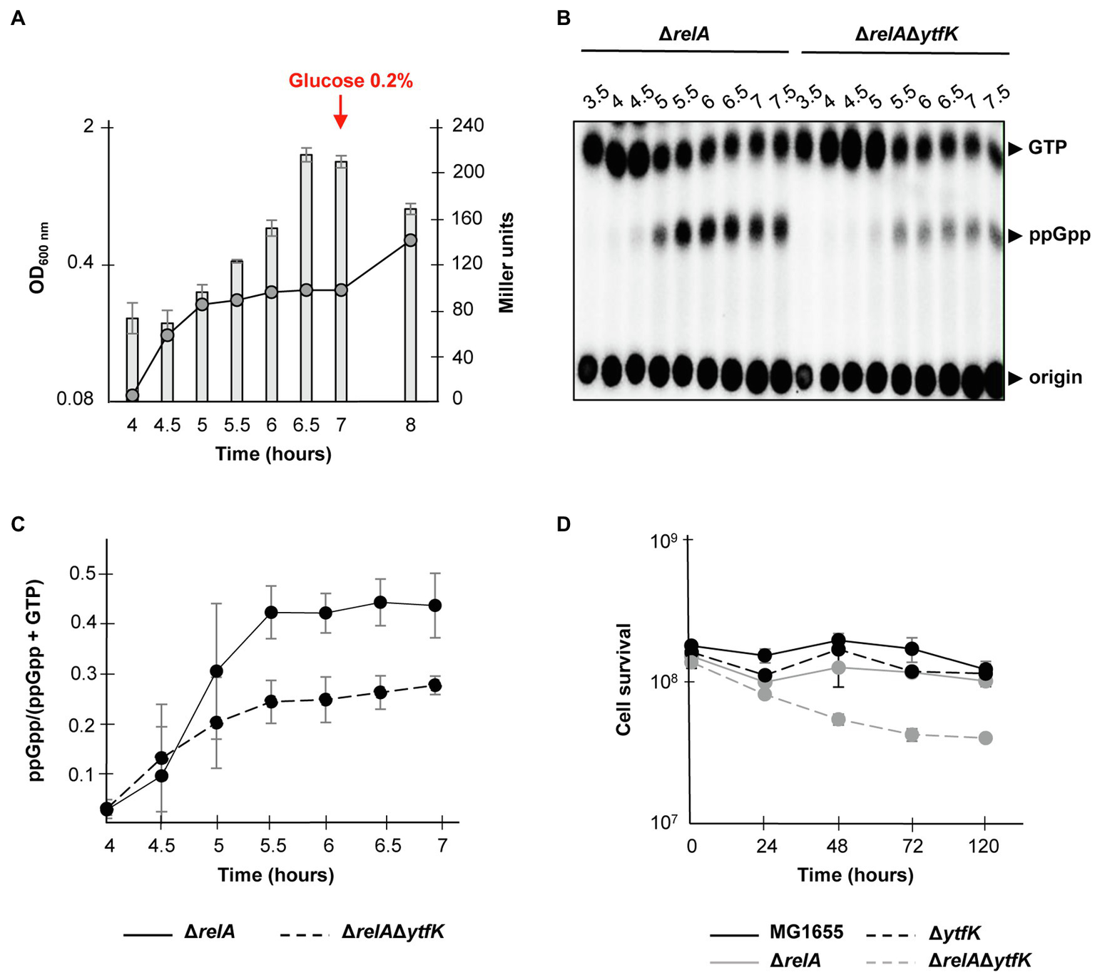 Bacteria were grown at 37°C overnight in MOPS medium containing 2mM KH2PO4 and 0.2% glucose. Cells were then diluted 100-fold in 500μl of fresh MOPS medium containing 0.4mM phosphate (KH2PO4) and 0.025% glucose. Cells were continuously and uniformly labeled with 5μl of 32P (0.37MBq/μl, PerkinElmer) and grown at 37°C with shaking (440rpm). Fifty microliters of samples were taken at the indicated times and 20μl of 21M ice-cold formic acid was added to stop the reaction. Samples were kept on ice for 20min and then stored at −20°C. Cell extracts were recovered by centrifugation (14,000 × g for 60min at 4°C). Five microliters of each sample were spotted into PEI Cellulose TLC (thin layer chromatography) plates (purchased from MercK-Millipore) and resolved with 1.5M KH2PO4 pH 3.4. TLC plates were then revealed by PhosphoImaging (GE Healthcare) and analyzed using ImageQuant software (GE Healthcare). The amount of ppGpp was normalized by the amount of pppGpp, ppGpp and GTP for the wild-type strain and the ΔytfK mutant and by the amount of ppGpp and GTP for the ΔrelA and ΔrelAΔytfK mutants.