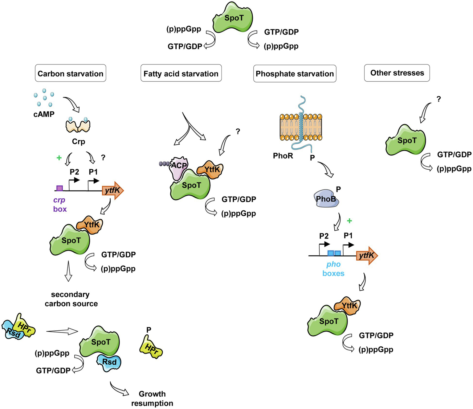 (p)ppGpp, stringent response, ytfK , cAMP, CRP, glucose starvation, E. coli