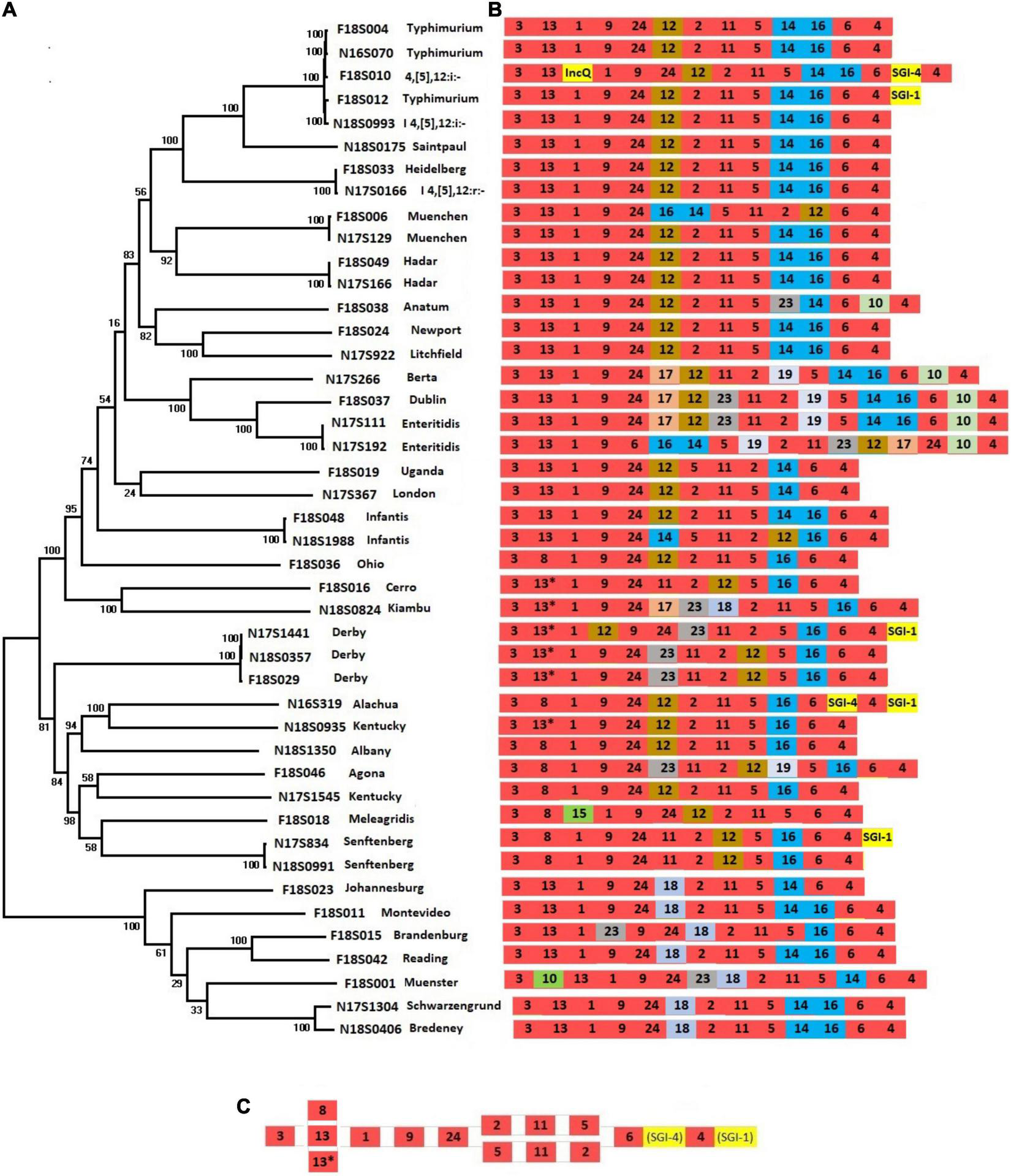 Presence of SPIs in different Salmonella serotypes. (A) A phylogenetic tree was constructed based on chromosomal SNPs of each of the isolates. (B) SPI arrangements are listed with representative sequences of each serotype. Red indicates that SPIs are conserved in all serotypes, yellow indicates insertions of SGIs or plasmids. Other colors represent SPIs whose presence are variable among different serotypes/isolates. (C) The conserved structure across all serotypes is shown.
