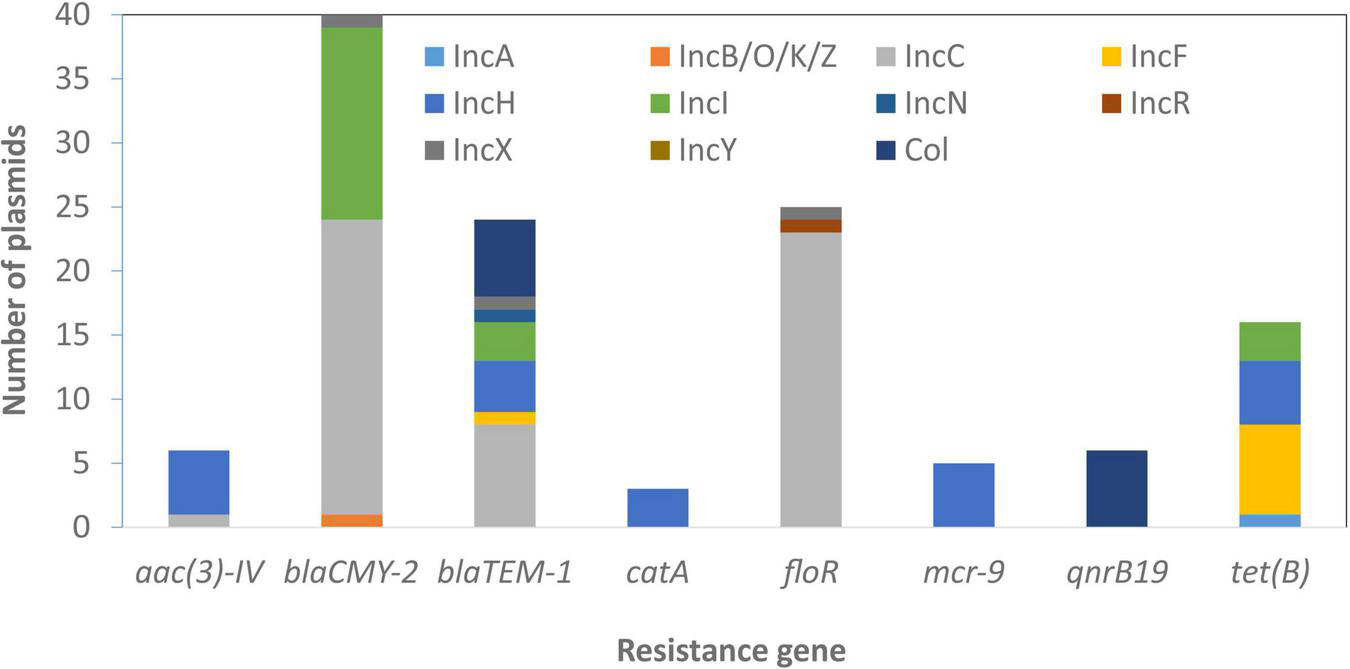 One way that Salmonella strains acquire ARGs is through acquisition of plasmids (Emond-Rheault et al., 2020). Plasmids carry not only ARGs, but also heavy metal and disinfectant resistance genes, which may contribute to co-selection for AMR (Vijayakumar and Sandle, 2019). The types of plasmids that Salmonella carry can vary considerably, as they may include species-specific non-conjugative plasmids, or conjugative plasmids found widely among Enterobacterales (Redondo-Salvo et al., 2020). Some plasmid types are highly associated with specific serotypes and sources (Zhao et al., 2020), thus plasmids provide important information for outbreak investigations and AMR source attribution. Traditionally, incompatibility plasmid types have been used to assign plasmids into different groups based on plasmid replication machinery (Carattoli, 2013). This approach does not account for all plasmid types and it is often unclear which replication machinery is dominant, especially in hybrid plasmids arising from recombination (Hsu et al., 2019).