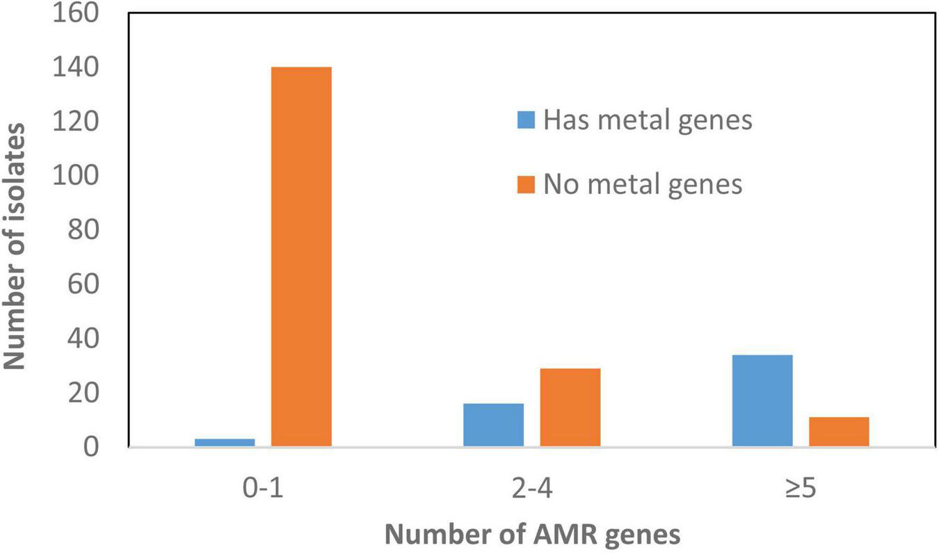 Chromosomal HMRGs were found in 51 of 134 isolates, including genes encoding resistance to copper, silver, mercury, and arsenic. These comprised 22 turkey, 14 swine, 11 chicken, and 4 cattle isolates. Thirty-nine of the fifty-one isolates with more than three chromosomal HMRGs also had chromosomal ARGs. In many cases, HMRGs and ARGs were physically linked (Table 2).
