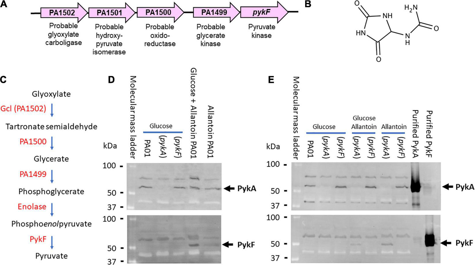 Figure 1. Genetic context and expression of PykF. (A) ORFs associated with the PA1489-PA1502 cluster and their predicted function. (B) Structure of allantoin. (C) Predicted metabolic reactions catalyzed by each encoded enzyme in the gene cluster. Note that glyoxylate and urea are the breakdown products of allantoin degradation. (D) PykF is not expressed in wild-type P. aeruginosa in the presence of glucose but is expressed in the presence of allantoin. The figure shows western blots of cell extracts of the indicated P. aeruginosa derivatives (wild-type PAO1, pykA mutant, or pykF mutant, as indicated) obtained after overnight growth in M9 medium containing glucose, glucose plus allantoin, or allantoin alone. The blot in the upper panel was probed with anti-PykA antibodies and the blot in the lower panel was probed with anti-PykF antibodies. The identity of the cross-reacting bands with higher molecular mass than PykA or PykF in each panel is not known, but their presence in the pykA and pykF mutant extracts indicates that they are unrelated to these pyruvate kinases. (E) Allantoin-induced PykF expression is abolished in a pykF mutant. The figure shows a western blot of cell extracts from a pykA or a pykF mutant (as indicated) grown in the presence or absence of glucose and/or allantoin (as indicated). To confirm minimal cross-reactivity of the antibodies, purified PykA or PykF (as indicated) were loaded on the right-hand side of each blot.