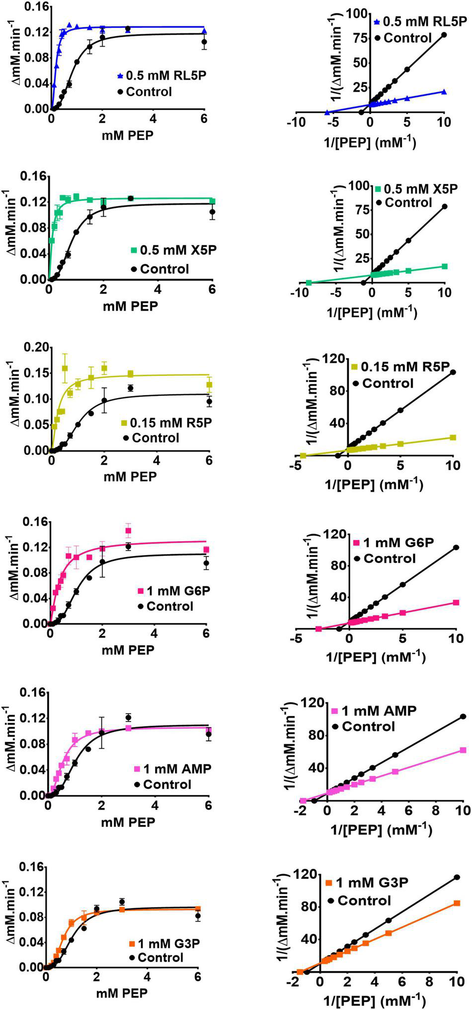 Figure 3. The metabolic regulation of PykF. (Left panel) Michaelis-Menten plots showing that the indicated regulators primarily convert PykF from sigmoidal to hyperbolic kinetics. Data represent the mean and standard deviation of three independent experiments. (Right panel) Lineweaver-Burk plots showing that the indicated regulators primarily act to decrease S0.5 of PykF compared with the control. “Control” indicates the reaction kinetics in the absence of added regulators. The changes in PykF kinetic constants elicited by each regulator are shown in Table 1. The 95% confidence interval estimates for the kinetic parameters are provided in Supplementary Table 4.