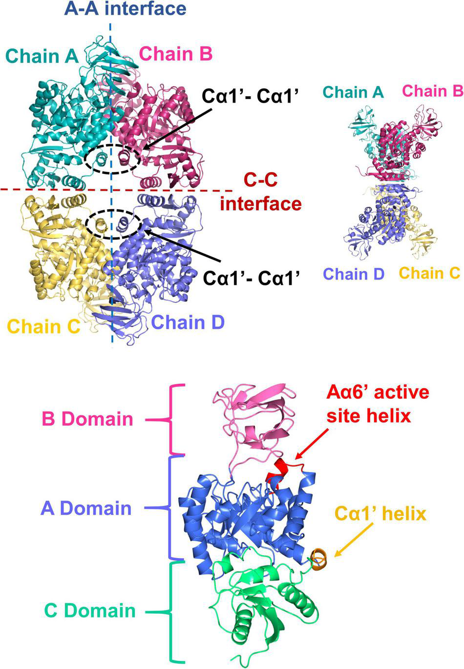 Figure 4. X-ray crystal structure of PykF. (Top diagrams) Front and side views of the PykF homotetramer. Chain A and B were already present in the asymmetric unit of PykF, whereas chains C and D were generated using symmetry coordinates. The A-A and the C-C interfaces are shown. The Cα1′ helices across the A-A interface are shown in dashed ovals. (Bottom diagram) Domain organization of a PykF subunit. A-, B- and C-domains of PykF are colored in blue, pink, and green, respectively. The active site helix and Cα1′ are colored in red and orange, respectively.