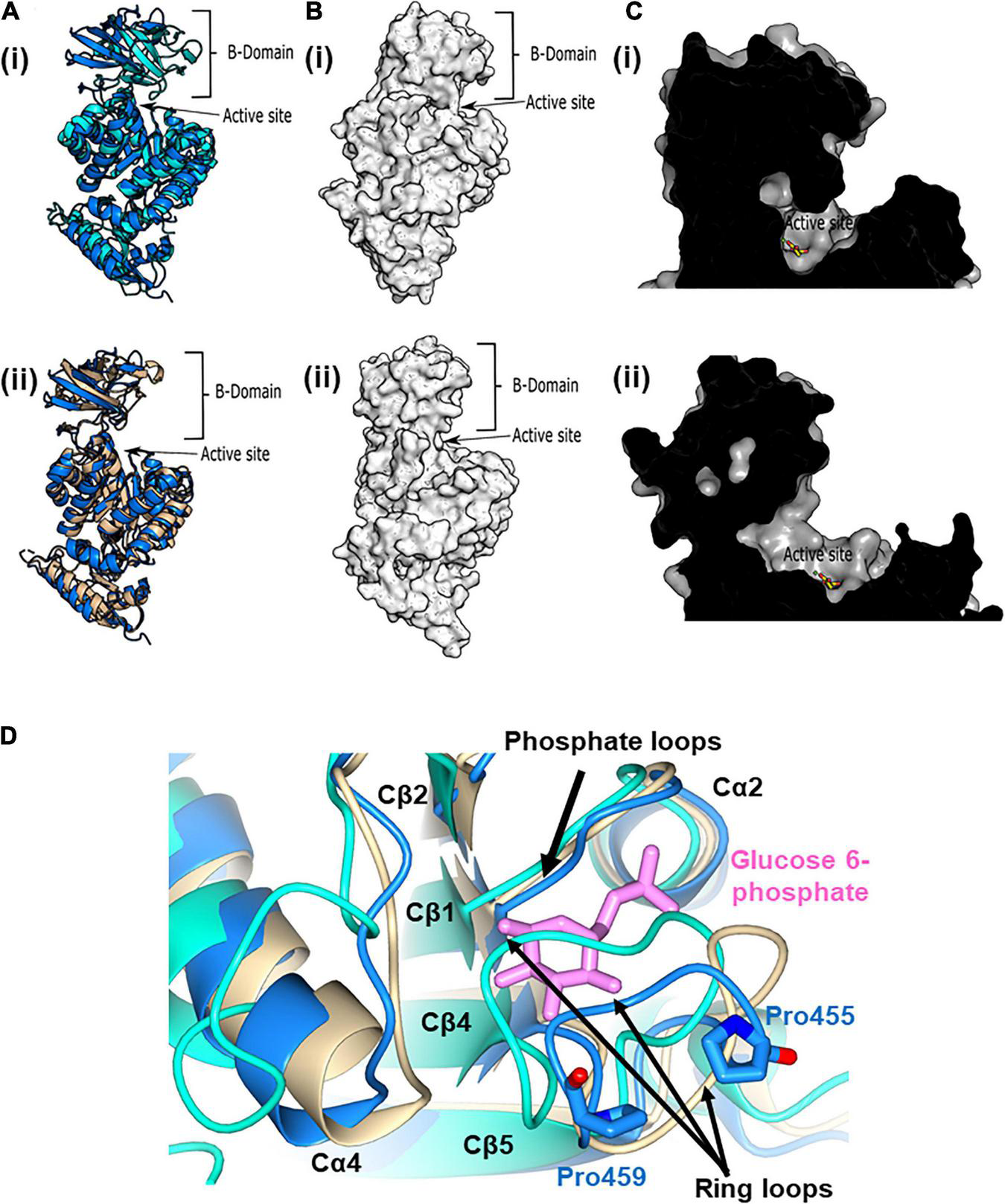 Figure 5. The active and allosteric sites of PykF. (A) (i) Cartoon representation of the crystal structure of a presumed inactive conformation of pyruvate kinase (PykFPA; 7OO1, blue) overlain onto the crystal structure of a presumed active configuration of the enzyme (PykAPA; 6QXL, cyan). (ii) Cartoon representation of the crystal structure of PykFPA (inactive configuration, 7OO1, blue) overlain onto the crystal structure of PykFEC (inactive configuration, 1PKY, yellow). (B) Surface representation of the crystal structure of PykAPA [(i) 6QXL] and PykFPA [(ii) 7OO1, blue]. (C) (i) Cross-section through the active site of PykAPA (active configuration of the enzyme, 6QXL) The substrate analog, malonate, is shown in yellow. (ii) Cross-section through the active site of PykFPA (inactive configuration of the enzyme, 7OO1). The superimposed binding mode of the malonate from 6QXL is shown in yellow. (D) Partial closure of the allosteric site of PykFPA. Superposition of the allosteric site in PykFPA (7OO1, blue), PykFEC (1PKY, yellow), and PykAPA (6QXL, cyan) showing disposition of the ring loop of PykFPA toward the allosteric site, probably determined by the configuration of Pro455 and Pro459. The G6P bound to PykAPA is shown as pink sticks.
