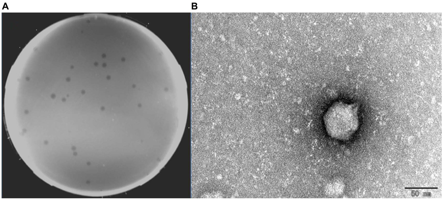 Plaques and transmission electron micrograph of phage BUCT609. (A) Plaques formed by BUCT609. (B) Transmission electron micrograph of phage BUCT609. Scale bar 50 nm.