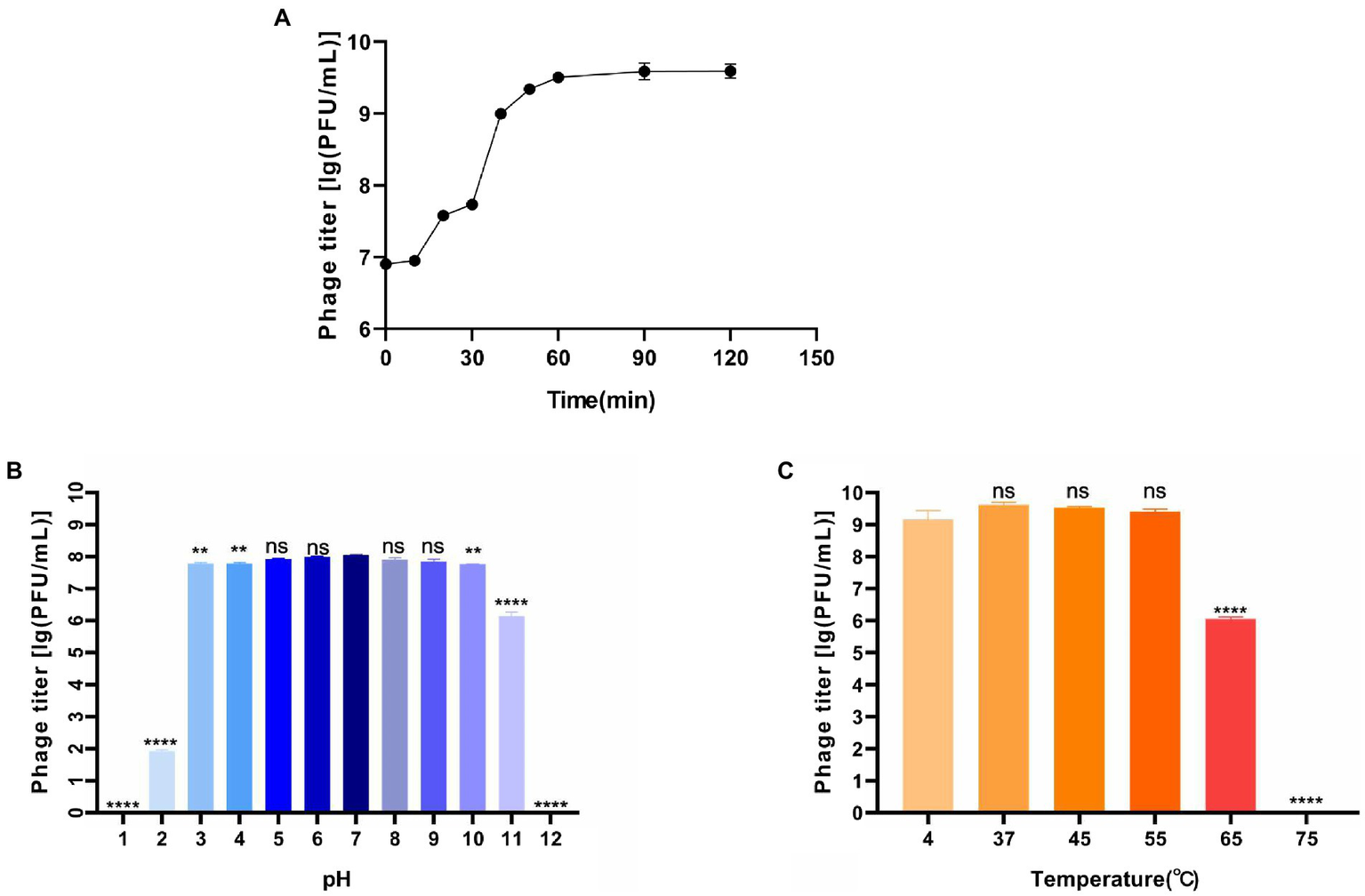 Biological characteristics of phage BUCT609. (A) One-step growth curve. The latent period of the phage was about 10 min, and the burst period of the phage was the following 60 min. And after 70 min, the phage grew into the plateau phase. The data is the average of three parallel experiments. Two bars above and below each point represent the standard deviation of the results of three parallel experiments. (B) Thermal stability. Phage titer of BUCT609 after incubation for 1 h at different temperatures. The data is the average of three replicates. There was no significant difference in the titer between 4 and 55°C. At 65 and 75°C, its titer decreased significantly (p < 0.0001) compared with that at 4°C. (C) pH sensitivity. Phage titer of BUCT609 after incubation at various pH values at 37°C for 1 h. The data is the average of three replicates. There was no significant difference in the titer from pH 5 to 9. Compared with the titer at pH 7, its titer decreased slightly (p < 0.01) at pH 3, 4, and 10 and decreased significantly (p < 0.0001) at pH 1, 2, 11, and 12. There is no significant difference between the two groups of data when p < 0.5, which was showed as ns in the figure. The bar above column represents the standard deviation of the results of three parallel experiments.