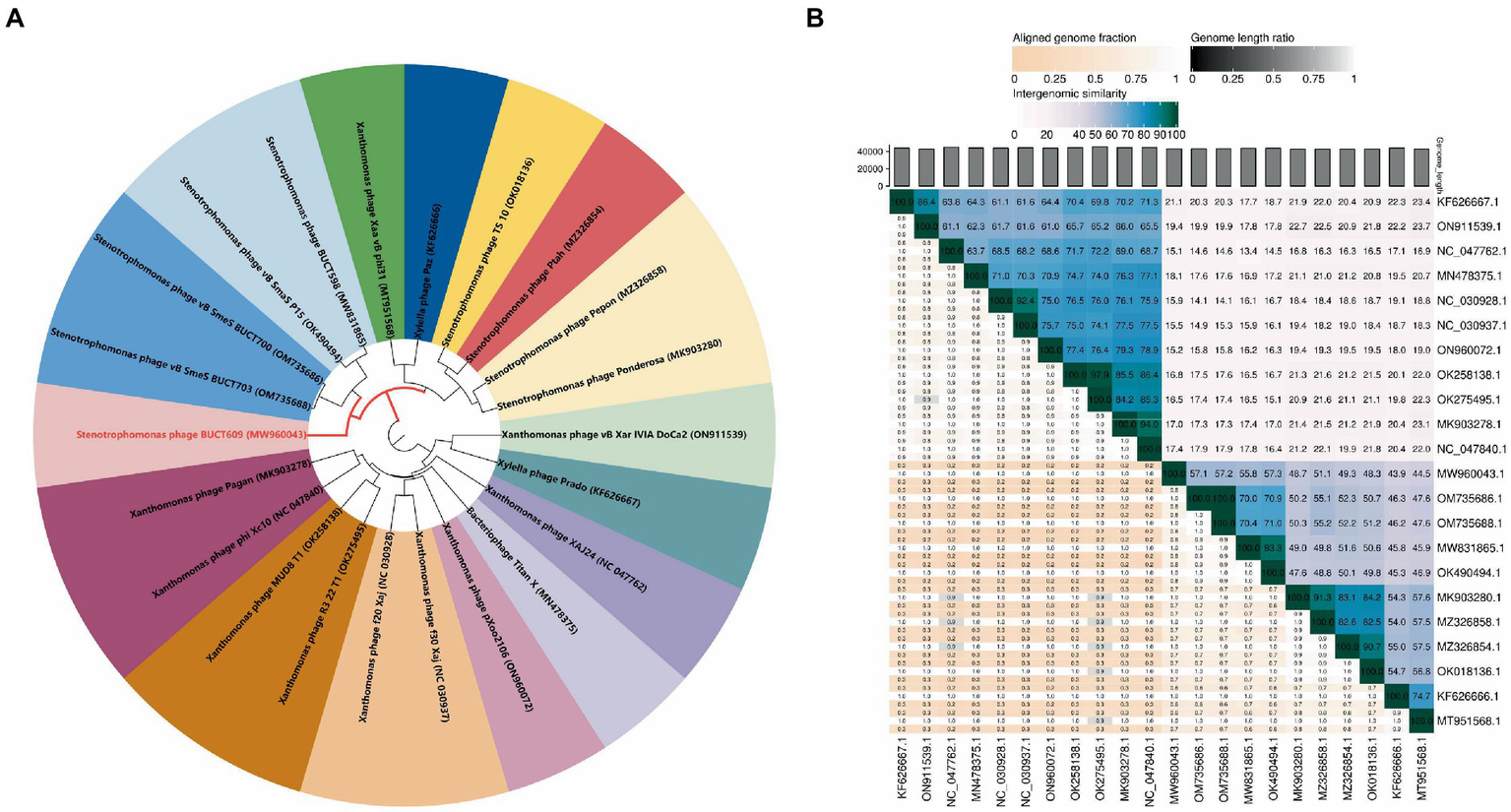 The whole genome was sequenced using Illumina’s MiSeq sequencing platform (Thermo Fisher Scientific, United States; Kozich et al., 2013) and the low-quality sequences were filtered by Trimmomatic (V0.32) program (Bolger et al., 2014). Then, the complete genomic sequence of BUCT609 was assembled by Newbler V3.0 software (Roche, Switzerland; Zhang et al., 2012) and CLC software (QIAGEN, Germany; Liu and Di, 2020). Using the online tools RAST (https://rast.nmpdr.org/; Aziz et al., 2008) to predict the ORFs and ORF Finder (https://www.bioinformatics.org/sms2/orf_find.html; Rombel et al., 2002) to annotate the DNA sequencing result. Sequence similarity analyses and comparisons were performed using the NCBI BLAST algorithm. A phylogenetic tree of phage BUCT609 was conducted by VICTOR (https://ggdc.dsmz.de/victor.php; Meier-Kolthoff and Göker, 2017) and average nucleotide identity (ANI) analysis was analyzed by another online tool VIRIDIC (http://rhea.icbm.uni-oldenburg.de/VIRIDIC/; Moraru et al., 2020).