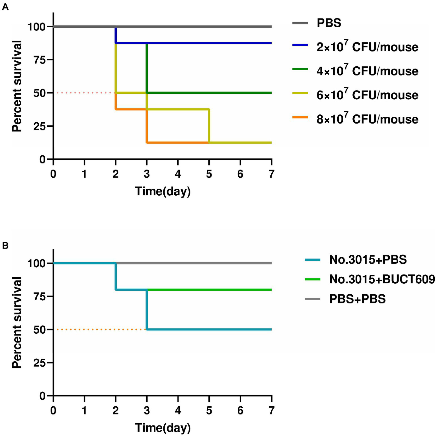 Specific pathogen-free (SPF) Balb/c mice reared for 6–8 weeks, weighing 17-19 g, were chosen as the animal model in this study. The median lethal dose (LD50) refers to the minimum number of bacteria required to kill half of the animal population through a specified route of infection within a specified period of time (Welkos and Brien, 1994). Pick a single clone of S. maltophilia No.3015 strain on the agar plate and cultivate it in LB liquid medium to exponential phase (37°C, 220 rpm). Then, the bacteria were centrifuged at 10,000 × g for 10 min and resuspended with PBS diluting to 8 × 107 CFU/ml, 6 × 107 CFU/ml, 4 × 107 CFU/ml, and 2 × 107 CFU/ml, respectively, for use. Forty mice were randomly divided into 5 groups (n = 8 in each group), of which 4 groups were used as the experimental group (injected with bacteria) and 1 group was used as the control group (injected with PBS). All mice were immunosuppressed by injection of cyclophosphamide (125 mg/kg) 4 days before infection and injected with cyclophosphamide (125 mg/kg) and dexamethasone (12.5 mg/kg) next day to stabilize the immunosuppression. After above pretreatment, each mouse was anesthetized by intraperitoneal injection of 50 mg/kg of 0.5% sodium pentobarbital. The experimental groups were injected intranasally with 40 μl of No.3015 bacterial solution with titers of 8 × 107 CFU/ml, 6 × 107 CFU/ml, 4 × 107 CFU/ml, and 2 × 107 CFU/ml, respectively, and the control group was injected with 40 μl of sterile PBS solution. The activity status of mice was observed twice a day after infection. The changes in body weight and death situation were recorded.