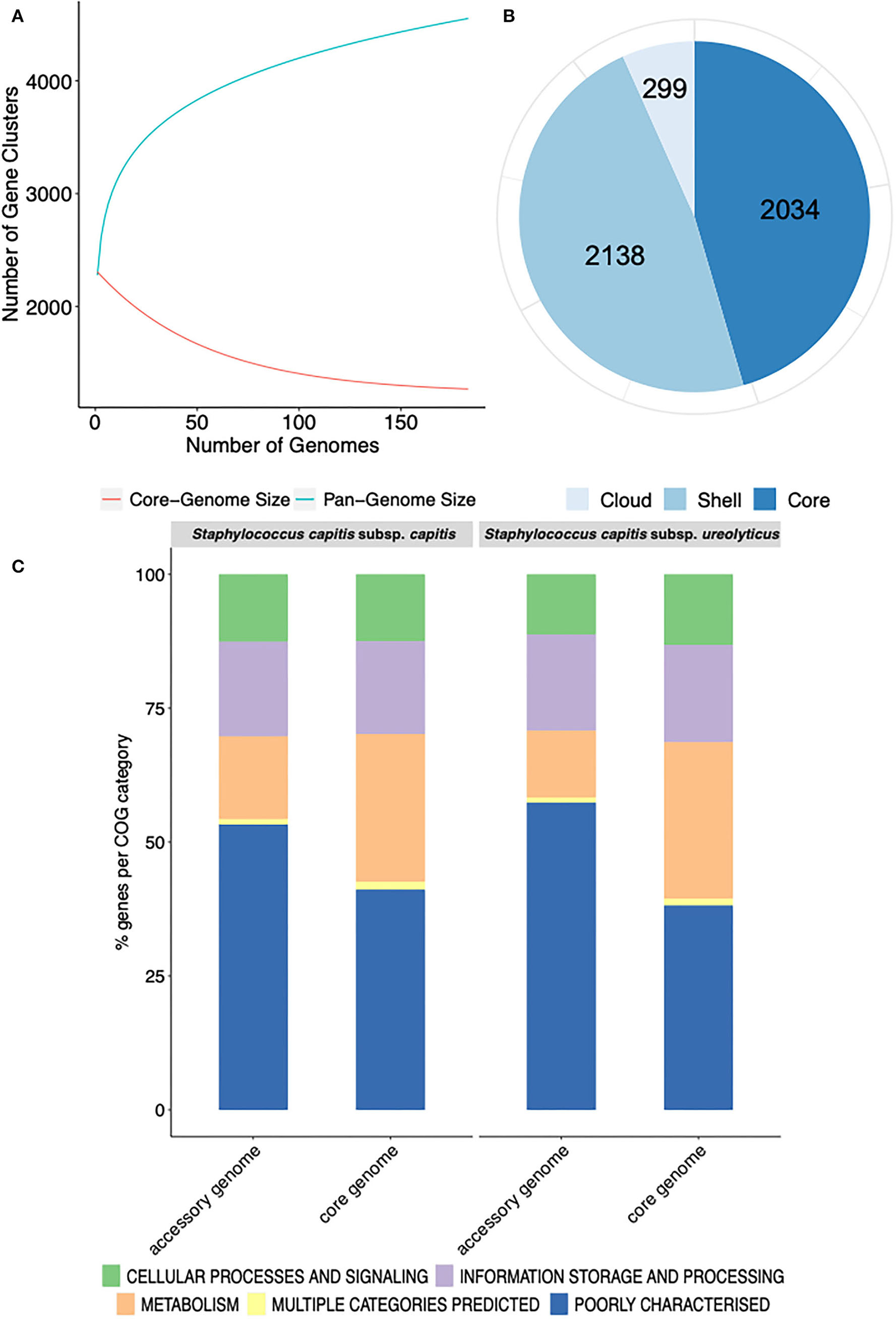 Representation of the pan-genome and COG functional annotation of S. capitis genomes. (A) Pan-genome curve generated by plotting the total number of gene families in the pan (blue) and core (red) genome of S. capitis. The graph represents how the pan- and core-genomes vary as genomes are added in random order. As the number of genomes increased, the pan-genome increased. (B)Staphylococcus capitis pan-genome statistics. The size of the pan-genome, including core (shared by >95% of isolates), shell (found in 15–95% of isolates), and cloud (found in <15% of isolates) genes. (C) Functional annotation of the core and accessory genomes of S. capitis subsp. capitis and S. capitis subsp. ureolyticus. Percentages of the core and accessory genomes annotated according to COG functional categories.