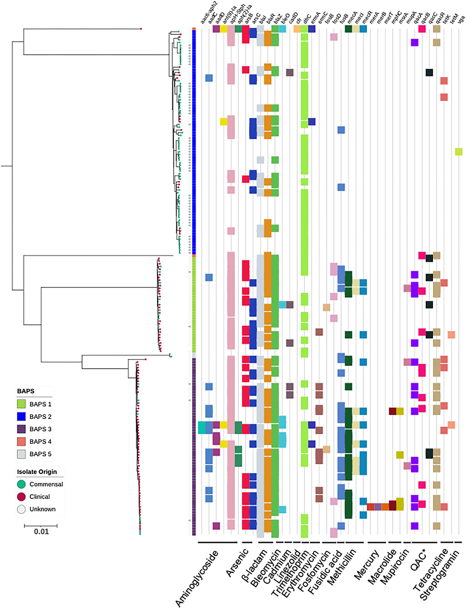Maximum-likelihood phylogeny based on core genome alignments of 186 S. capitis isolates, presenting the presence and absence of antimicrobial resistance genes. ML tree is midpoint rooted, and bootstrap support values were calculated from 1,000 replicates. The first color block represents rhierBAPS clustering, dots describe the setting where isolates were retrieved; green = commensal (including scalp samples from this study), red = clinical, and gray = unknown. Filled gray triangles describe scalp isolates from this study. The subspecies differentiation of S. capitis is presented as the subclades described as BAPS groups 1, 3, 4, and 5. The presence (colored blocks) and absence (white blocks) of antimicrobial resistance is denoted for each isolate (*Quaternary Ammonium Compounds). The scale bar represents the number of nucleotide substitutions per site. The figure was visualized using iTol v 4.2 (Letunic and Bork, 2016).