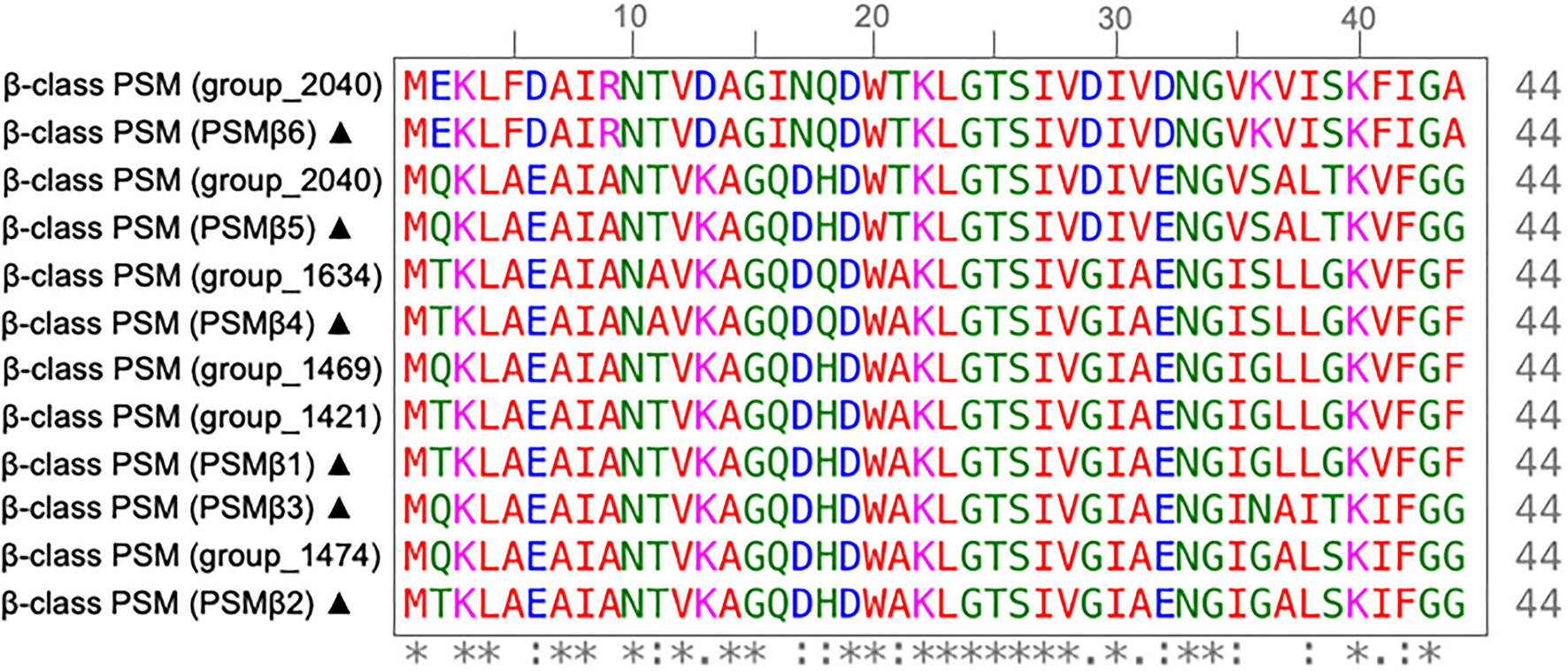 Multiple sequence alignment of β-class phenol soluble modulins (PSMs) of S. capitis isolates. MSA of β-class PSMs protein sequences found in S. capitis genomes from this study and those described by O'Neill (2020) (sequences marked with ▴) created with ClustalW (Clustal et al., 1994). Residues are colored based on an amino acid property (red: small and hydrophobic, blue: acidic, magenta: basic, green: hydroxyl, sulfhydryl, and amine, and gray: unusual), positions that contain fully conserved residues are marked with an asterisk, and positions marked with a colon indicate conservation between groups of amino acids with similar properties.