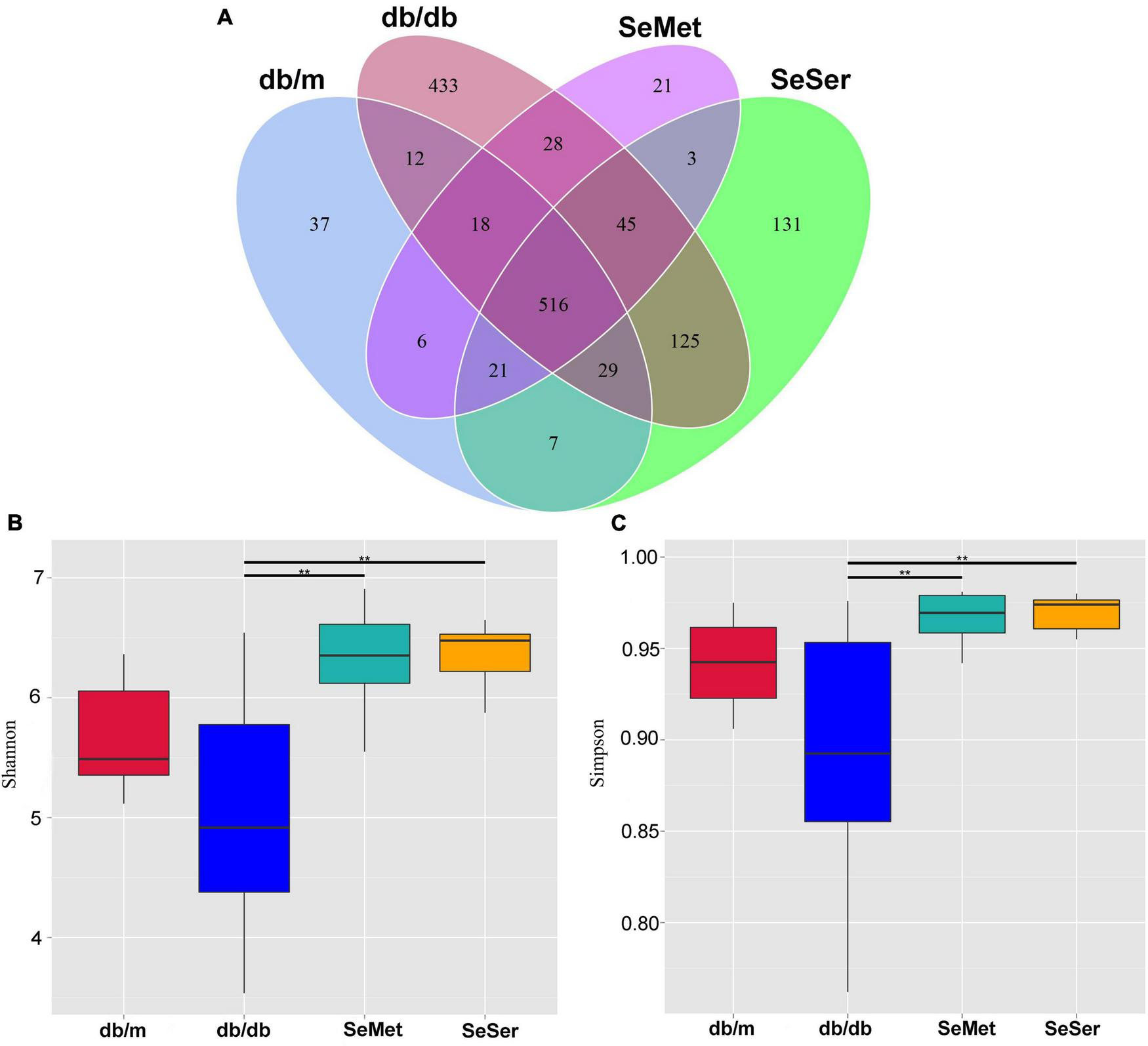 Administration of selenomethionine and serine increased alpha-diversity of gut microbiota in db/db diabetic mice. (A) Venn diagram of OTUs; (B) Shannon index; (C) Simpson index. Values are expressed as mean ± SEM, n = 8. **P < 0.01.