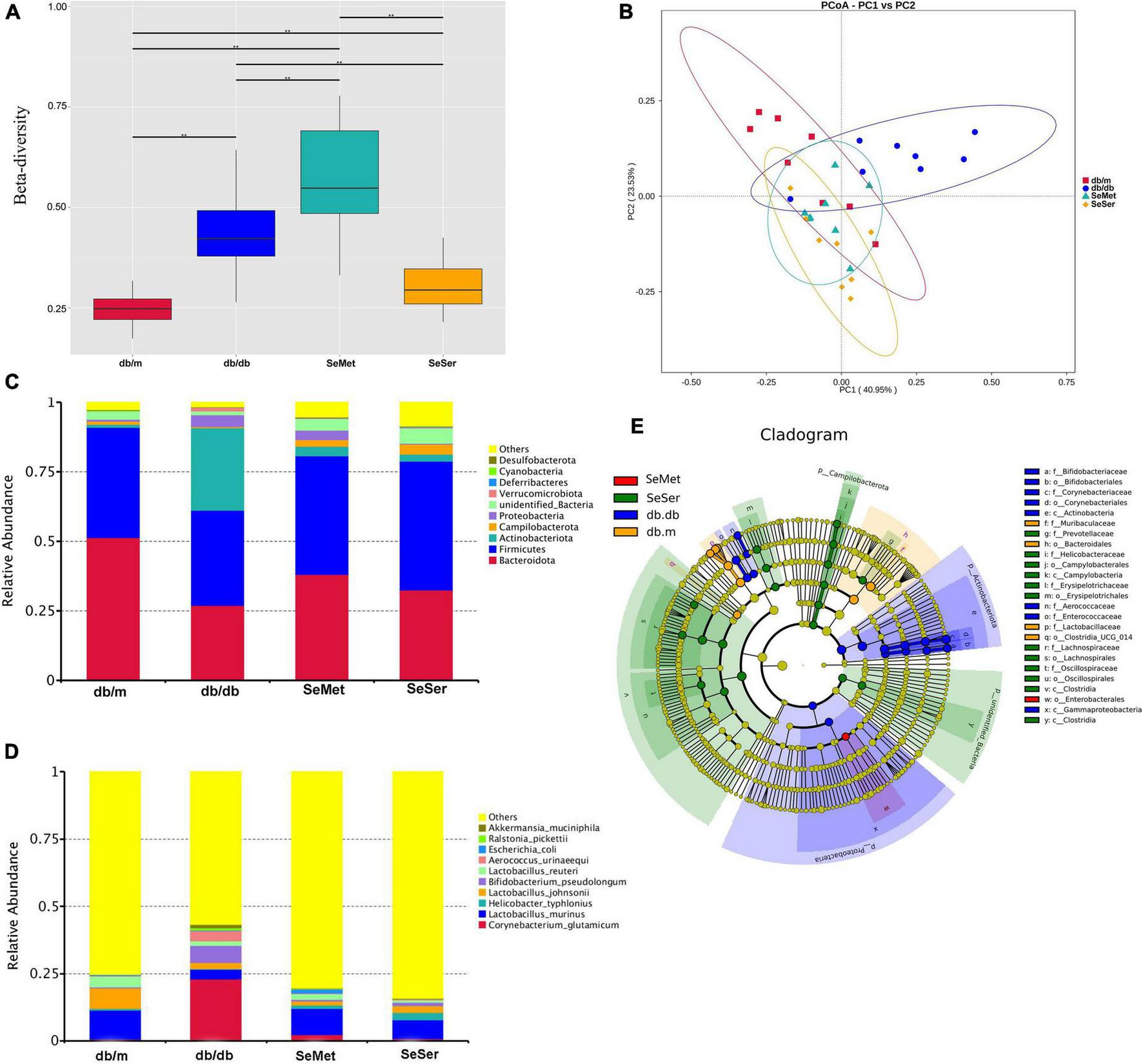 The beta diversity at the species-level in mice in the four treatment groups were significantly different from each other (Figure 4A). Moreover, the results of the unweighted Unifrac PCoA analysis showed that the microbial structure in the feces of mice from db/db group was separated from the other three groups (Figure 4B). At the phylum level, mice in the db/db group had decreased abundance of Bacteroidetes and Firmicutes and increased abundance of Actinobacteriota, when compared with those in the db/m group; Administration of selenomethionine alone and in combination with serine retrieved these changes (Figure 4C). At the species level, mice in the db/db group had increased abundance of Corynebacterium glutamicum, Bifidobacterium pseudolongum, and Aerococcus urinaeequi, and decreased abundance of Lactobacillus murinus and Lactobacillus johnsonii; Administration of selenomethionine alone and in combination with serine restored these changes (Figure 4D). Analysis with the linear discriminant analysis (LDA) effect size (LEfSe) method showed that the db/db group was characterized by Actinobacteriota, while the SeMet group was characterized by Enterobacterales and the SeSer group was characterized by Campilobacterota (Figure 4E).