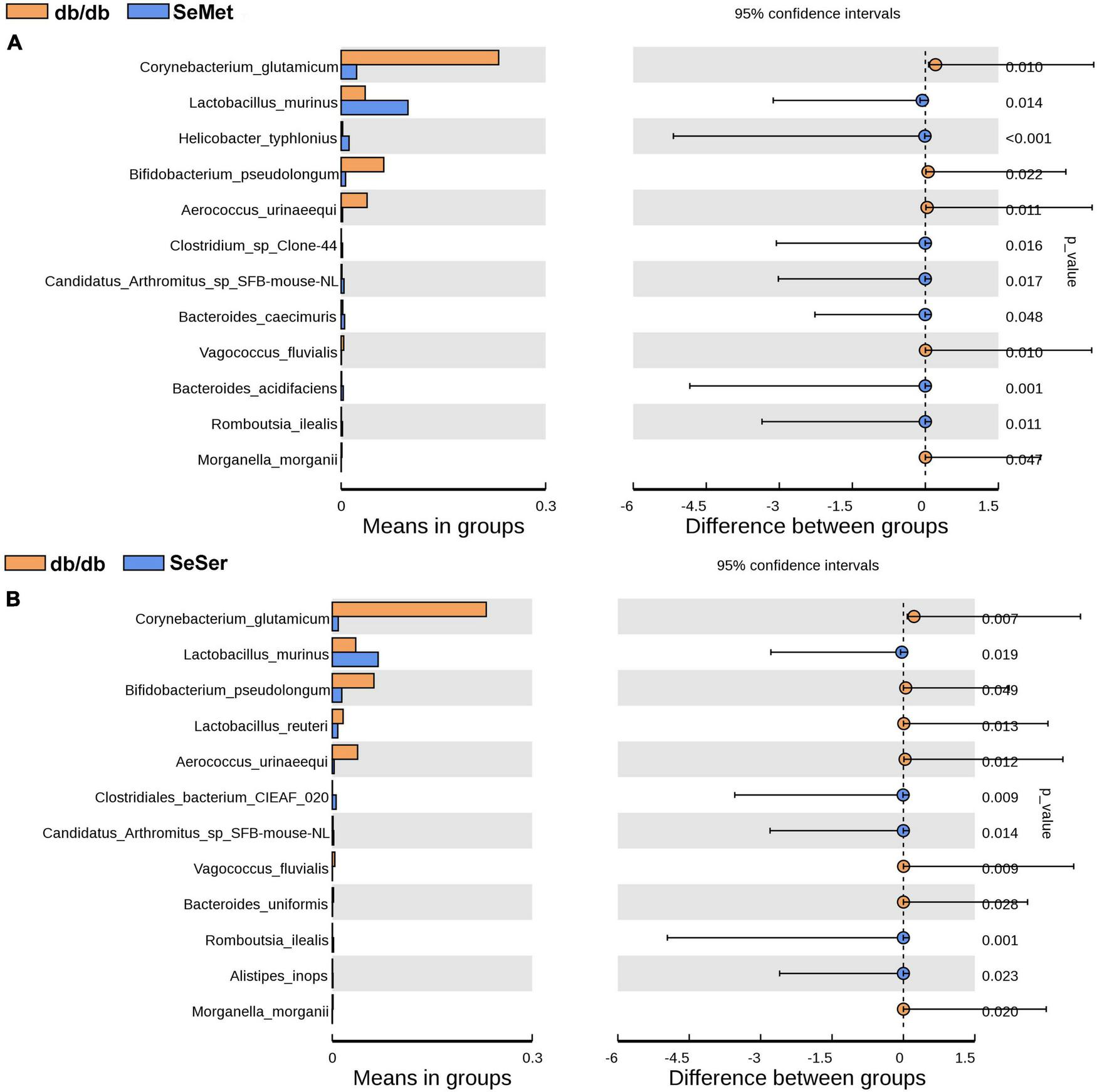 The difference of microbe abundance in the db/db, SeMet and SeSer groups by using T-test analysis. (A) Difference between the db/db and SeMet group; (B) difference between the db/db and SeSer group.