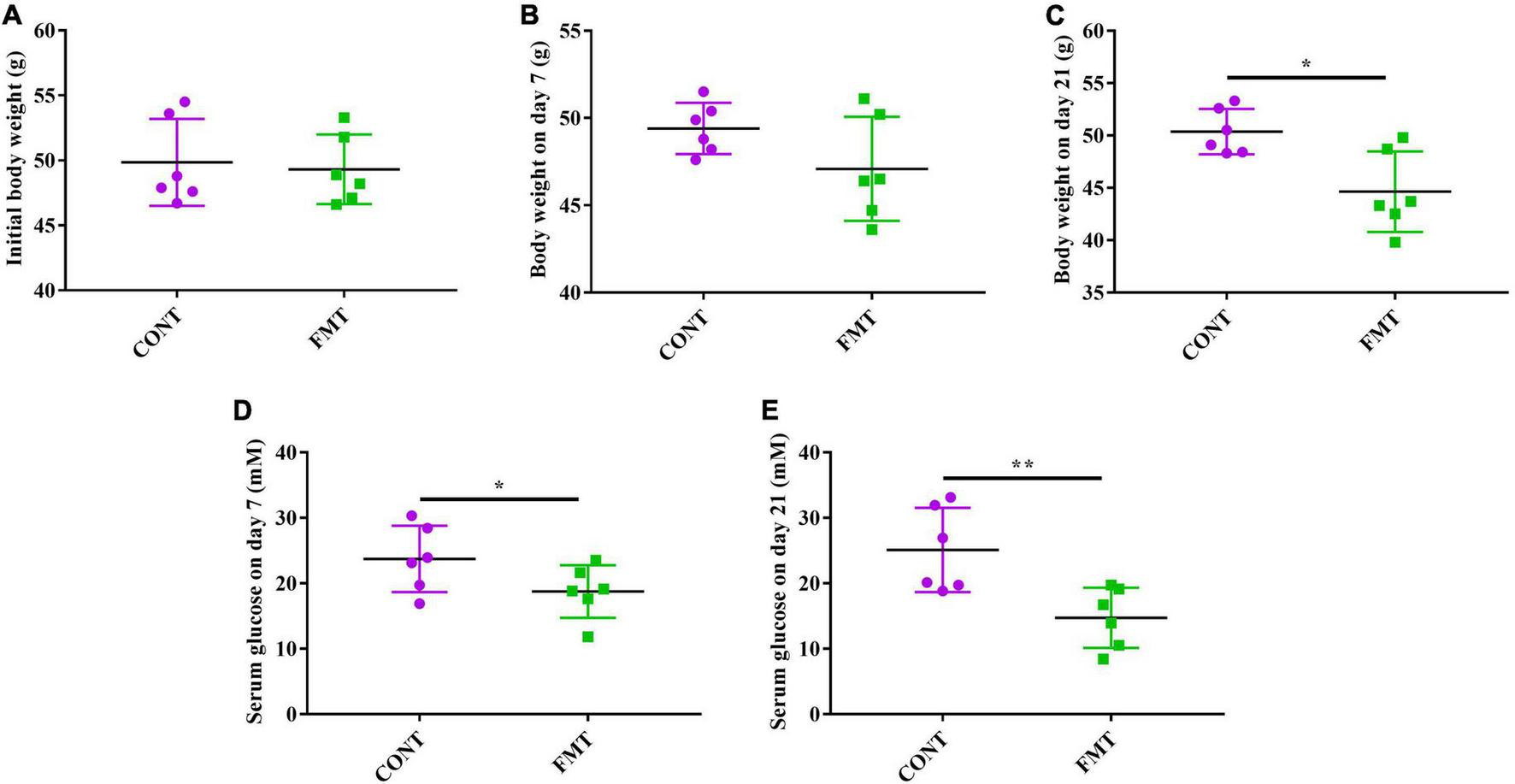 The db/db mice in the CONT and FMT group had similar body weight at the start of the experiment (Figure 6A), while we observed no significant changes in body weight after FMT for 7 days (Figure 6B). However, db/db mice in the FMT group had significantly decreased body weight on day 21, when compared with those in the CONT group (Figure 6C). Moreover, db/db mice in the FMT group had significantly decreased glucose level on day 7 (Figure 6D) and day 21 (Figure 6E) when compared with those in the CONT group.