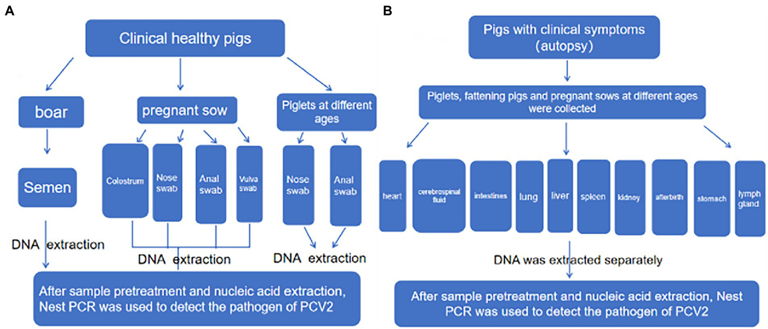 Sampling scheme diagram. (A) Clinically healthy pigs. (B) Piglets at different ages.