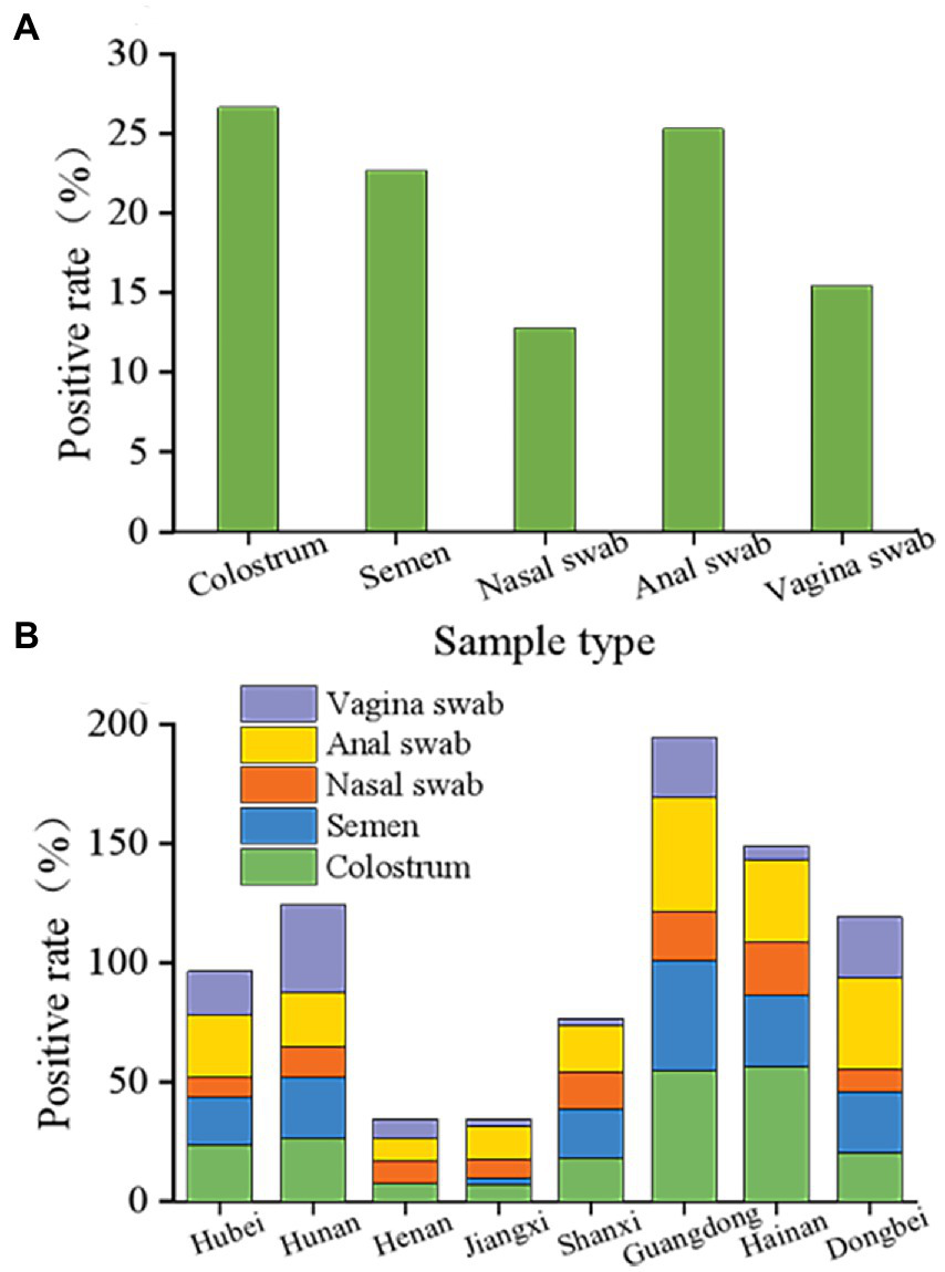 Overall status of porcine circovirus type 2 excretion. (A) Overall elimination of PCV2 in different organs of pigs in eight provinces. PCV2 is detoxified through colostrum, semen, nose, anus, and vulva and still showed a high positive rate following immunization with the ring vaccine. The positive rates of colostrum, semen, and anal swabs were similar, 26.65, 22.71, and 25.30%, respectively. Nasal swabs and vulvar swabs were recorded as 12.81 and 15.47%, respectively. (B) Different excretion pathways of pigs in the eight provinces. Among them, the positive range of colostrum was 7.35 to 56.69%, and the positive rate of colostrum from Jiangxi province was the lowest at 7.35%. The positive colostrum rate in Hainan province was the highest at 56.69%. The lowest semen-positive rate was 0 in Henan province, while the highest was observed in Guangdong province at 46.35%. The detection rates in the anus, nose, and vulva were 9.26 to 47.79%, 7.74 to 22.02%, and 2.67 to 36.84%, and the lowest detection rates were in the Henan, Shanxi, and Jiangxi provinces. The provinces with the highest detection rates were Guangdong, Hainan, and Hunan.