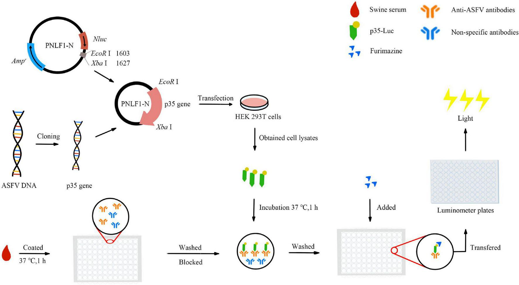 The synthetic full-length p35 gene of ASFV (Pig/HLJ/18strain) (Shi et al., 2021), was amplified with the primers (p35F:5′-GCGAATTCATGGGGAATGACCCGCCGGT-3′, p35R: 5′-CCTCTAGATTAATGGTGATGGTGATGATGCCCCCCTA-3′) including the EcoRI and XbaI restriction enzyme sites (underlined), and the amplified fragment was subsequently purified and cloned into the secreted luciferase expression vector pNLF-1-N (Promega, USA) by the restriction enzyme sites of EcoRI and XbaI. The pNLF-1N-p35 recombinant plasmids were verified by sequencing. The amount of 1 μg pNLF-1N-p35 plasmids were transfected into 2 × 105 HEK 293 T cells using lipofectamine™ 2000 transfection reagent (Invitrogen) according to the manufacturer’s instructions. Thirty-six hours after transfection, the 293T cells transfected with the pNLF-1N-p35 recombinant plasmids were lysed in ice-cold RIPA buffer, the cell lysates was then centrifuged at 10,000 g for 5 min at 4 °C to collect the supernatant. The p35-Luc fusion protein was verified via Western blotting with the inactivated ASFV-positive serum kept in our lab (Shi et al., 2021). In addition, the specificity of the p35-Luc fusion protein was determined by detecting of the sera raised against three swine pathogens including PRRSV, CSFV and PCV2 via Western blotting. The supernatants were harvested and stored at −20 °C till use.