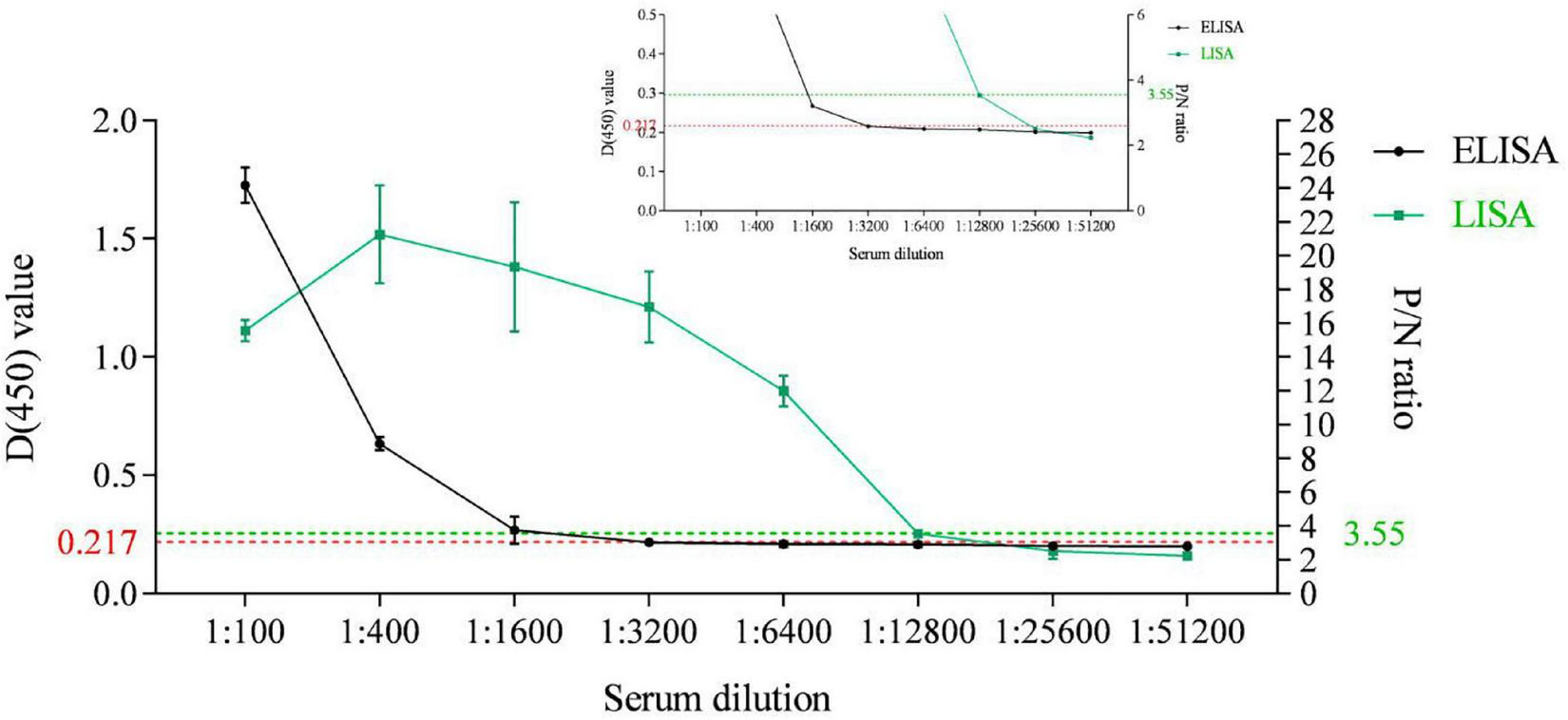 To directly define the sensitivity of the p35-Luc LISA, the p35-ELISA method established in our lab was used as the control (Shi et al., 2021), an inactivated ASFV-positive and a -negative serum samples were used to analyze and compare the LOD of the both methods. Briefly, the testing serum samples were serially four times diluted starting at 1:100, the values of optical density at 450 nm (OD450) RLU for the diluted serum samples were determined via the p35-ELISA and the p35-Luc LISA under the optimized protocol (Shi et al., 2021). Here, the OD values of 0.217 were considered as the cutoff values of the p35-ELISA (Shi et al., 2021) while, the P/N values of 3.55 were setup as the cutoff values of the p35-Luc LISA.
