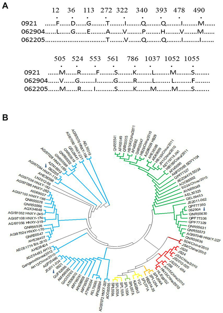 Clades and phylogenetic tree of M segments of three novel isolates. (A) M segments of isolates (0921, 062205, and 062904), Number showed the different amino acids among of them (1,073 amino acids of M segment). (B) The M phylogenetic tree of the three isolates with 99 different isolates was aligned using Mega 11 (Mega 6.0 software updated version). According to the M phylogenetic tree, 0921 and 062205 belonged to the C2 clade. 062904 belonged to the C3 clade. Clades C1-C4 and J are represented with different colors: Green-C3 clade, Crimson-C1 clade, Red-C4 clade, Blue-C2 clade, Yellow-J clade. The blue triangle marked the loci of 0921, 062904, and 062205 on the phylogenetic tree.