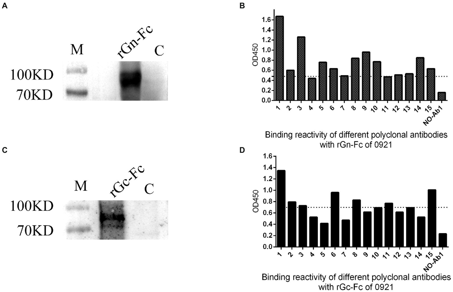 Cross reactivity of rGn-Fc/rGc-Fc of 0921 strain with different sera from SFTS donors. (A) rGn-Fc of 0921 strain by Western blot. The molecular weight of rGn-Fc is about 90KD. (B) Sera from SFTS donors reacted with rGn-Fc by ELISA. 15 sera were collected from donors in 2021. 14 of 15 sera reacted with rGn-Fc. The dotted line showed cut-off value. (C) rGc-Fc of 0921 strain by Western blot. The molecular weight of rGc-Fc is about 90KD. (D) Sera from SFTS donors reacted with rGc-Fc by ELISA. 9 of 15 sera reacted with rGc-Fc. The dotted line showed cut-off value.