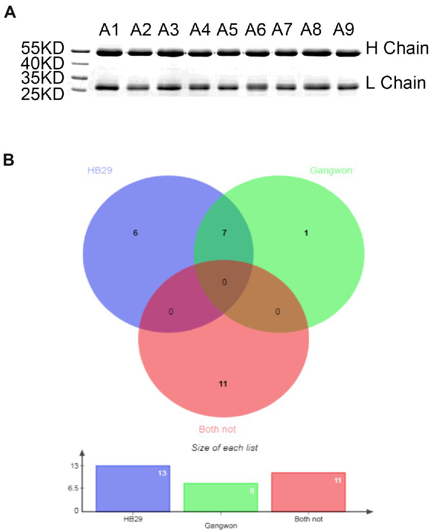 The neutralizing activity of IgG from 25 different patients against pseudovirus of HB29 and Gangwon. (A) IgG purified from sera of convalescent by SDS-PAGE. The molecular weight of the heavy chain is 50 KD, and the Light chain is over 25 KD. The purity is over 95%. (B) Venn diagram shows 25 nAbs that neutralized pseudovirus HB29 and Gangwon strain analyzed using online software. Violet blue highlights 13 nAbs that neutralized HB29 pseudovirus, green highlights eight nAbs that neutralized Gangwon pseudovirus, and red highlights 11 nAbs that neutralized neither HB29 pseudovirus nor Gangwon pseudovirus. There are seven nAbs that neutralized both HB29 and Gangwon pseudovirus.