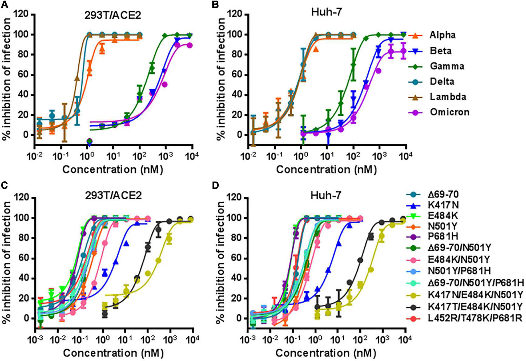 Inhibitory activity of LCB1 against divergent SARS-CoV-2 variants. The activities of LCB1 peptide in inhibiting VOCs and VOI (A,B) as well as the panel of mutant pseudoviruses carrying single or combined mutations (C,D) were measured by the single-cycle infection assay. Samples were tested in triplicate, the experiments were repeated three times, and data are expressed as the means with standard deviations (SD) and presented in Table 1.