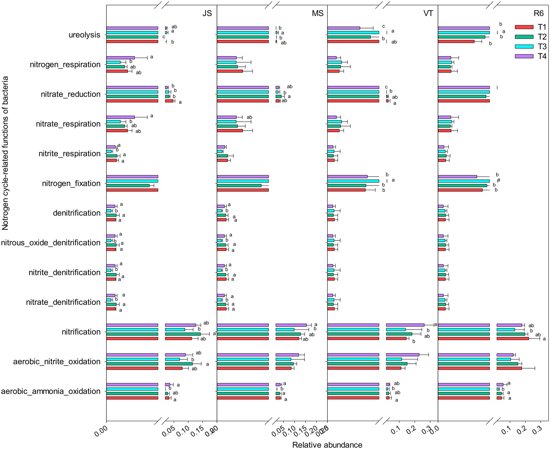 Figure 4. Nitrogen cycle-related functions of the bacterial communities as predicted by FAPROTAX. Different letters represent significant differences (p < 0.05). JS, jointing stage of wheat; MS, maturity stage of wheat; VT, tasseling stage of maize; R6, maturity stage of wheat.