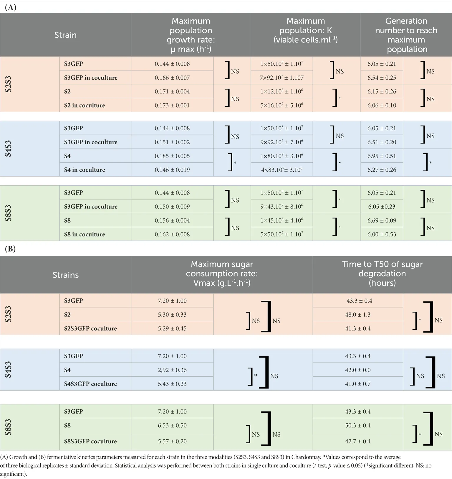 We first investigated the impact of the co-inoculation of two strains of S. cerevisiae on various phenotypic traits of growth and fermentation kinetics (Table 1). A previous study (Bordet et al., 2022) showed that the S3GFP strain and its corresponding wild type strain had identical growth and fermentation kinetics. Therefore, only the S3GFP strain will be considered in this section to follow it in coculture over time.