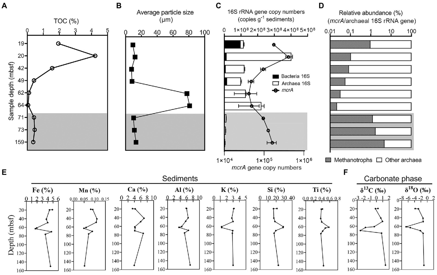 Depth profiles of TOC (A), average particle size (B), gene abundance of bacterial and archaeal 16S rRNA genes and mcrA(C), the ratio of mcrA gene copies in archaeal 16S rRNA gene copies (D), major elemental contents concentration (E) and stable carbon and oxygen isotopes composition of carbonate (F) of the sediment samples from Core W01. The gas hydrate-free zone is indicated by shaded area.