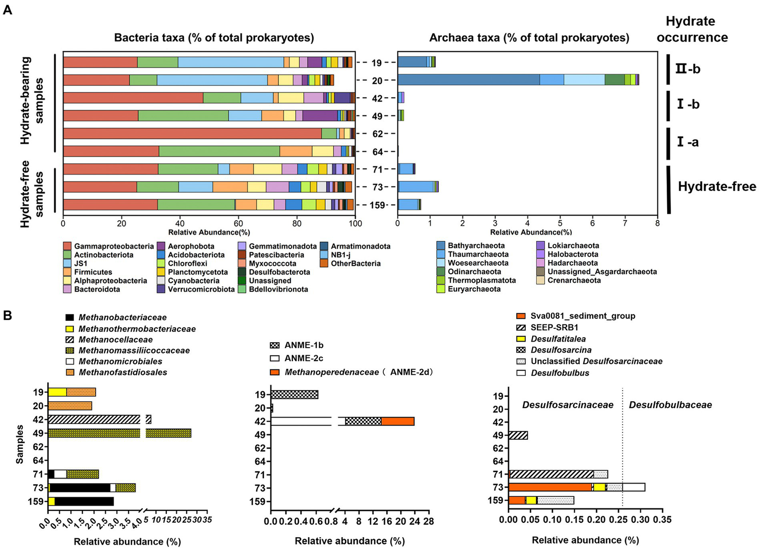 The bacterial taxa of all samples are dominated by Gammaproteobacteria and Actinobacteria. The phyla ‘Atribacteria’ lineage JS1 and Aerophobota were significantly abundant in the silty hydrate-containing sediments, other than in sandy ones; while the archaeal communities changed dramatically throughout the vertical profile of sediment layers and a spatial heterogenicity of anaerobic methanotrophs was also determined.