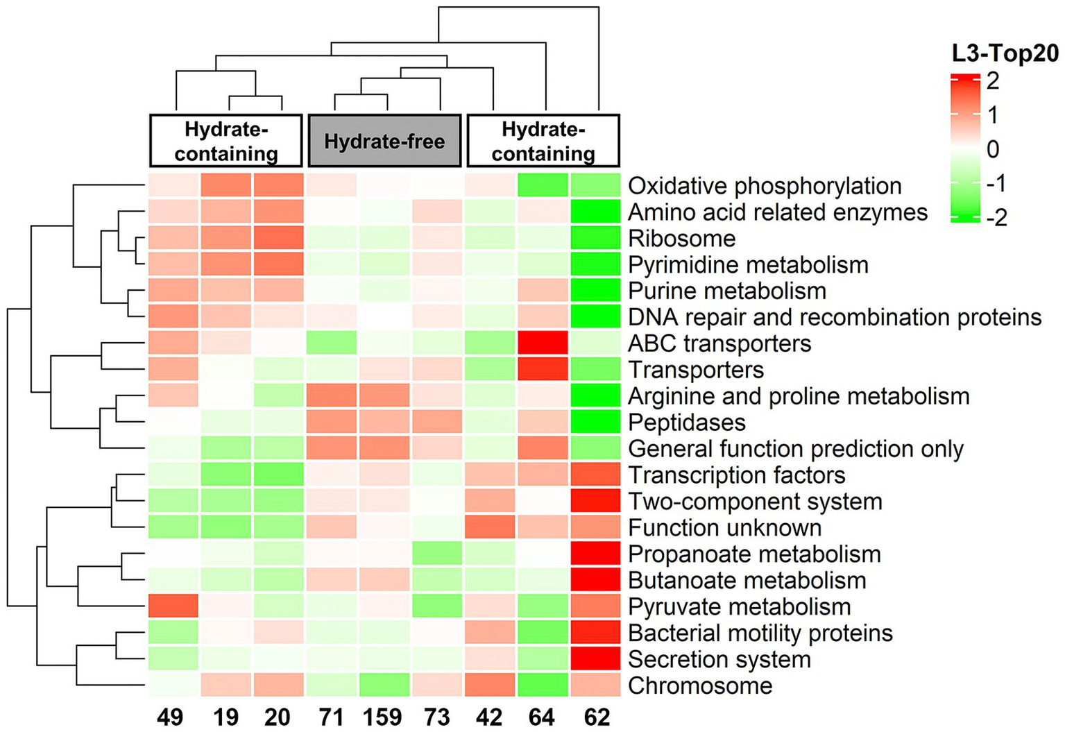 Further, the sequence data were employed in PICRUSt analysis to predict the functional diversity of the microorganisms in each sample. A heatmap was made from the top 20 KEGG orthologue (KO) groups according to functional annotation and abundances, and all groups were clustered based on functional relative abundance. As seen from the heatmap, the functional potential of microbial communities from Core W01 differed along the depth, in particular, gas hydrate-free samples had a higher KO abundance in protein metabolic pathways such as “Arginine and proline metabolism” and “Peptidases” (Figure 5).