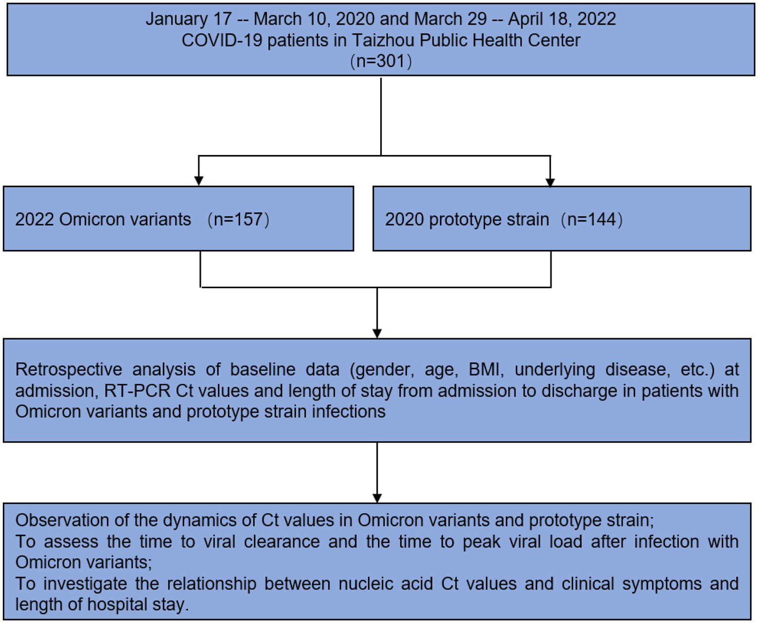 A retrospective analysis was made on 301 cases of patients with COVID-19 who were admitted to Taizhou Public Health Center from January 17, 2020, to March 10, 2020, and from March 30, 2022, to April 18, 2022. The infected SAS-cov-2 virus strain divided the patients into 157 cases infected with the Omicron variant and 144 cases infected with the wild-type strain (prototype strain) (Figure 1).