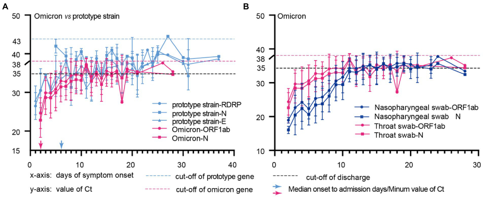 The nucleic acid test Ct values of patients infected with Omicron variants or prototype strains were collected from throat swabs, nasopharyngeal swabs, and sputum and fecal specimens from admission to discharge.