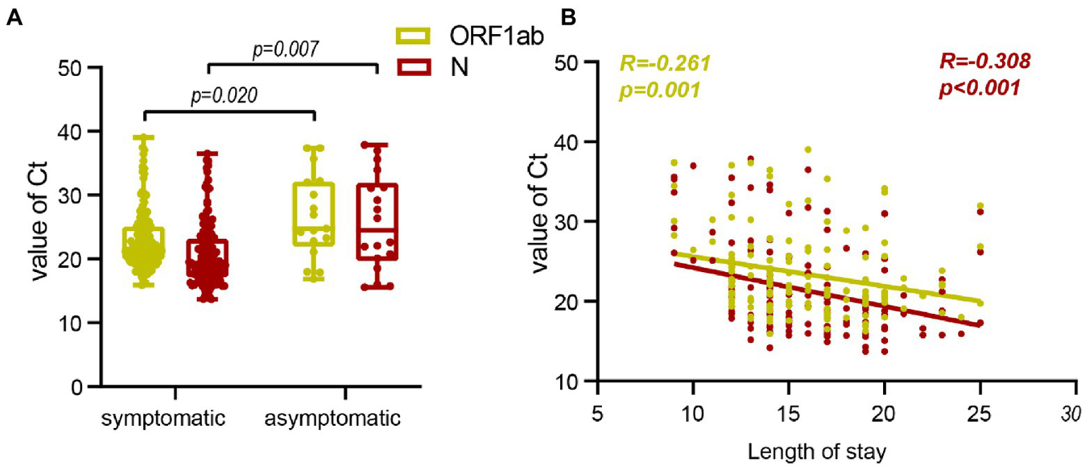 Correlation analysis was conducted to further assess the difference between symptomatic and asymptomatic clinical indicators of Ct after Omicron variants infection. It showed a negative correlation between lower admission Ct values and longer length of stay (Figures 3, 4B).