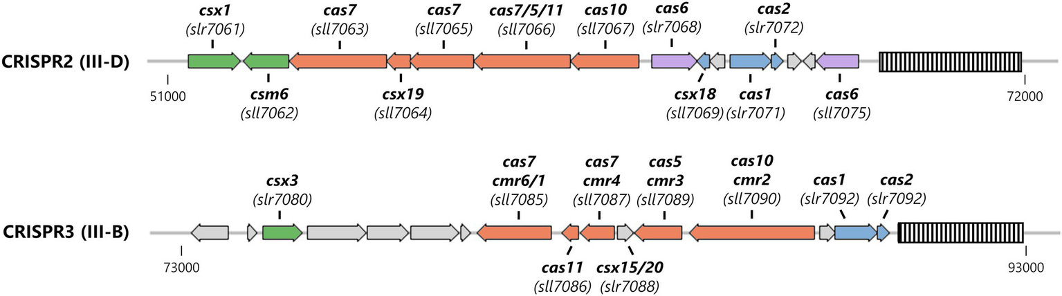 Organization of the Type III CRISPR-Cas systems encoded on the large plasmid pSYSA in Synechocystis. The CRISPR arrays are shown as striped boxes. Genes are color-coded: adaptation-associated genes (blue), effector complex components (salmon), pre-crRNA processing (purple), and ancillary genes putatively involved in cOA-signaling (green).