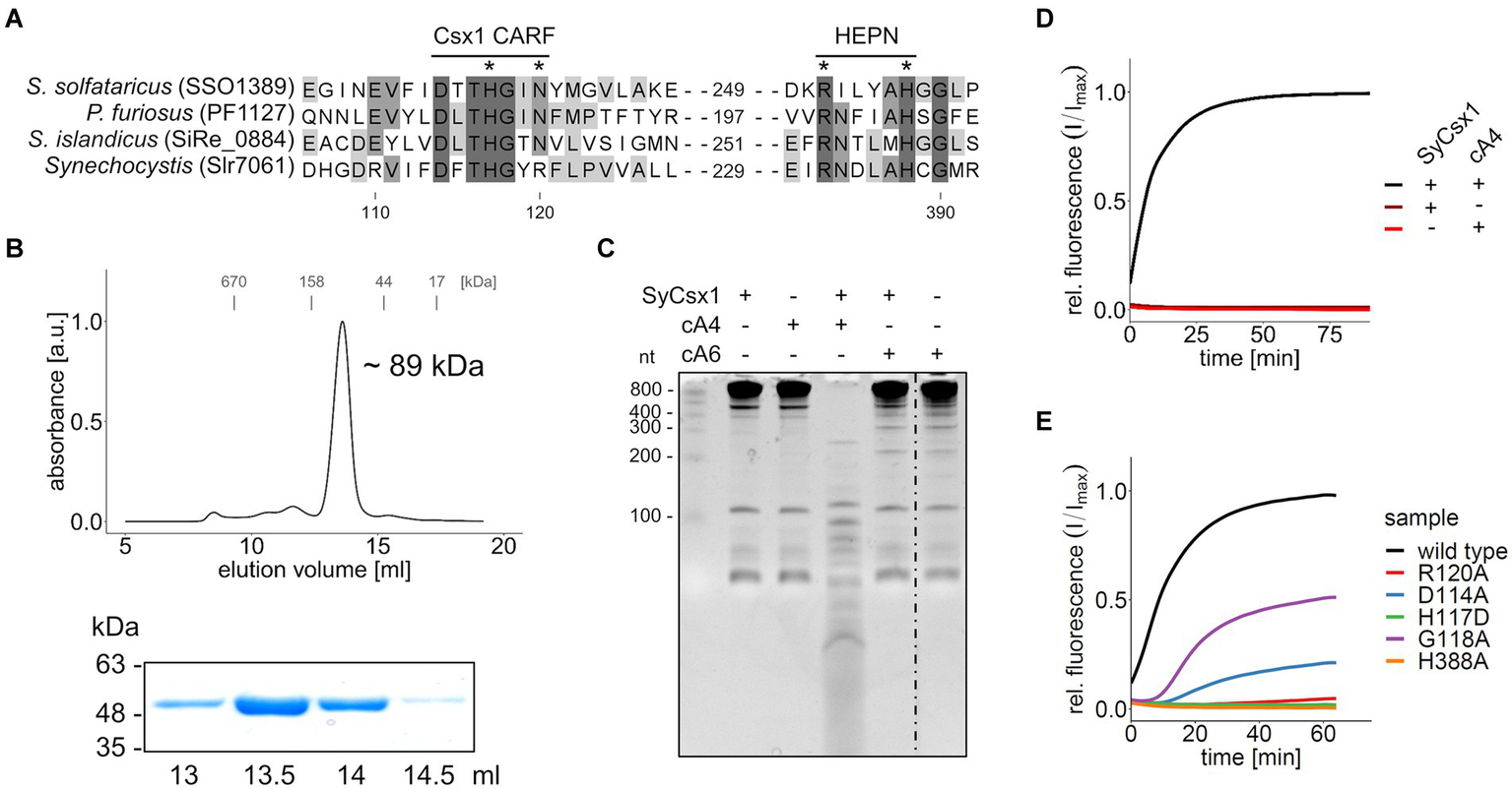 SyCsx1 shows cA4-dependent ribonuclease activity. (A) Multiple sequence alignment of SyCsx1 and homologous Csx1 proteins showing the conserved DxTHG motif from the CARF domain and the RxxxxH active site of the HEPN domain. An asterisk marks residues that were shown to impact protein function. (B) His-tagged SyCsx1 (48.7 kDa) was isolated from E. coli by affinity chromatography and further purified by size-exclusion chromatography on a Superdex 200 10/300 column (upper panel). Elution fractions were analyzed by SDS-PAGE (lower panel, see Supplementary Figure S1). (C) 400 ng of Synechocystis total RNA were incubated in the presence or absence of SyCsx1 and 300 nM cOAs for 1 h and subsequently separated on a 12% denaturing PAA gel. The dotted line indicates a non-contiguous sample that was omitted from the gel. (D) A fluorogenic ribonuclease activity assay measuring the cleavage of 40 nM RNaseAlert substrate by SyCsx1 depending on the addition of 300 nM cA4 (excitation 490 nm; emission 520 nm). The cleavage of the RNaseAlert substrate separates a fluorophore/quencher pair, generating a fluorescent signal. (E) Fluorogenic ribonuclease activity assay of SyCsx1 variants with point mutations in the ligand-binding site of the CARF domain or the active site of the HEPN domain. All fluorogenic assays were performed in triplicates and mean values of relative fluorescence normalized to the maximum substrate turnover are shown.