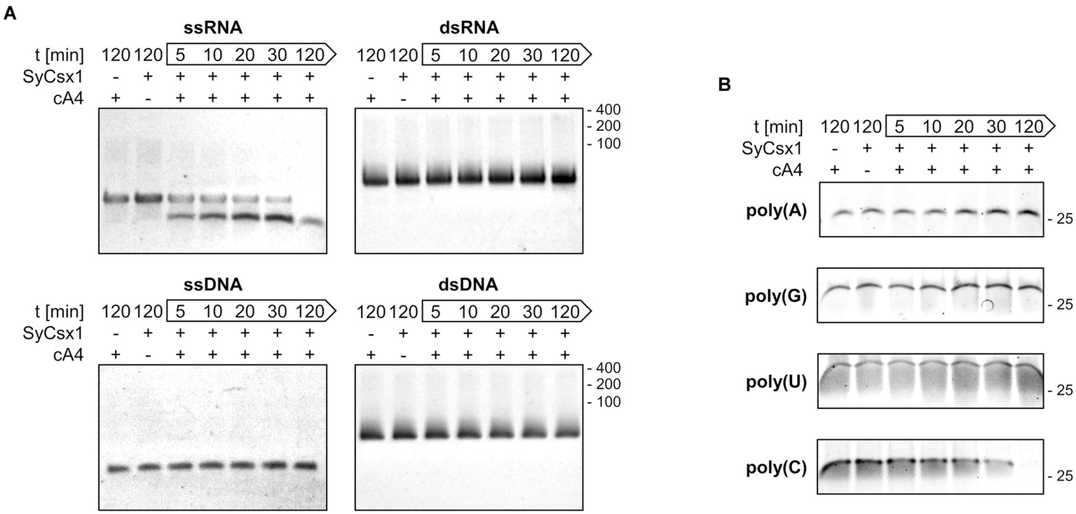 SyCsx1 is a single-strand-specific ribonuclease with a strict preference for cytosine bases. (A) Cleavage of 5 μM single- and double-stranded RNA or DNA oligonucleotides (40 nt) by SyCsx1 at 30°C after the addition of 300 nM cA4. 10 μl aliquots of were sampled at indicated time points, separated on 12% denaturing PAA gels, and stained with ethidium bromide. (B) 25 nt RNA-homopolymers were incubated with SyCsx1 and cA4 at 30°C and analyzed as before, except that SybrGold was used for staining.