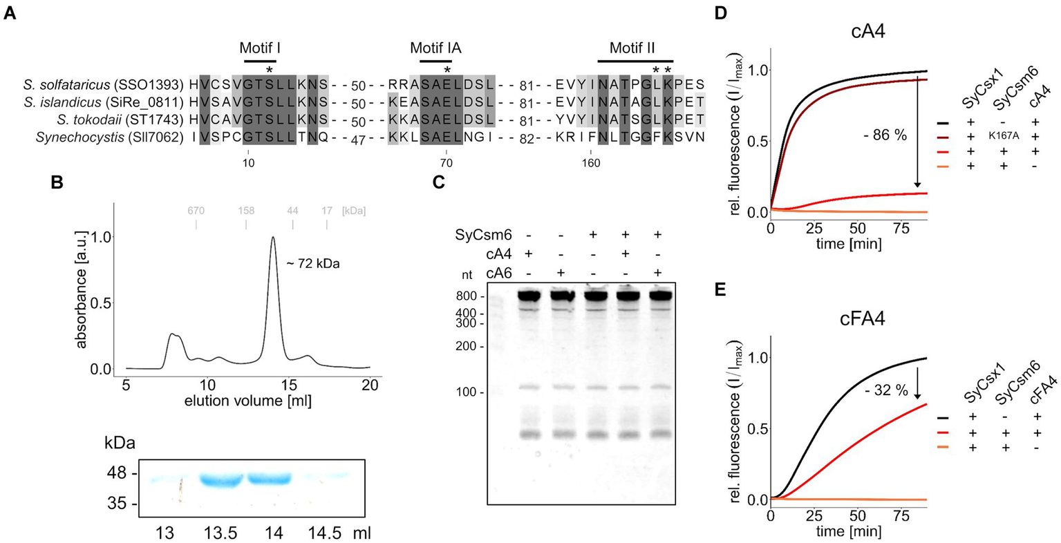 SyCsm6 has ring-nuclease activity but does not cleave RNA in vitro. (A) Multiple sequence alignment of SyCsm6 (Sll7062) and homologous Csm6/Crn1 proteins showing conserved CARF domain motives implicated in cOA-binding and cleavage. An asterisk marks residues that were shown or predicted to impact ring nuclease activity. (B) His-tagged SyCsm6 (43.5 kDa) was isolated from E. coli by affinity chromatography and further purified by size-exclusion chromatography on a Superdex 200 10/300 column (upper panel). Elution fractions were analyzed by SDS-PAGE (lower panel, see Supplementary Figure S1). (C) 400 ng of Synechocystis total RNA were incubated in the presence or absence of SyCsm6 and 300 nM cOAs for 1 h and subsequently separated on a 12% denaturing PAA gel. (D) A fluorogenic ribonuclease activity assay measuring RNA cleavage by SyCsx1 after pre-treatment of 30 pmol cA4 with either wild-type SyCsm6, the putatively inactive K167A variant, or a control without protein. After the pre-treatment for 60 min at 30°C and inactivation of SyCsm6 by heating to 95°C for 5 min, the reaction was started by adding SyCsx1 and 20 nm RNaseAlert substrate (excitation 490 nm; emission 520 nm). (E) The same assay as before using tetrafluoro-c-tetraAMP (cFA4) as the substrate. All fluorogenic assays were performed in triplicates and mean values of relative fluorescence normalized to the maximum substrate turnover are shown.