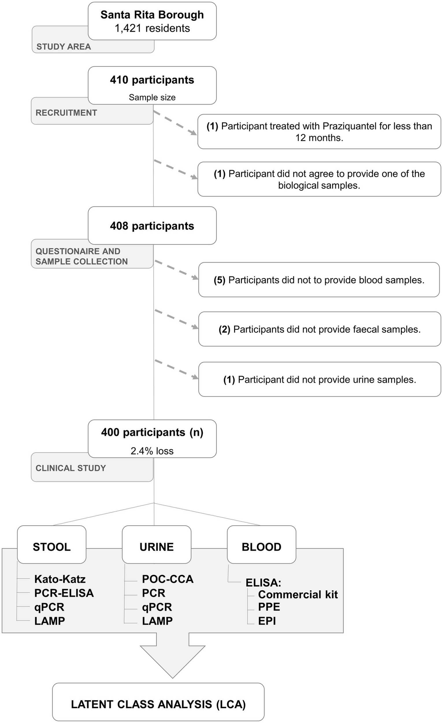 A total of 410 residents of the borough of Santa Rita were included in the study after the recruitment step, which was conducted at the local BHU Waldemar José Pereira. All the participants received unique ID numbers (from 001 to 410) to preserve their confidentiality. Ten individuals were excluded from the study either due to: one person had a previous treatment with praziquantel, one participant did not agree to provide one of the biological samples during the recruitment process, eight individuals did not deliver one of the three types of biological sample during the collection or delivery process.