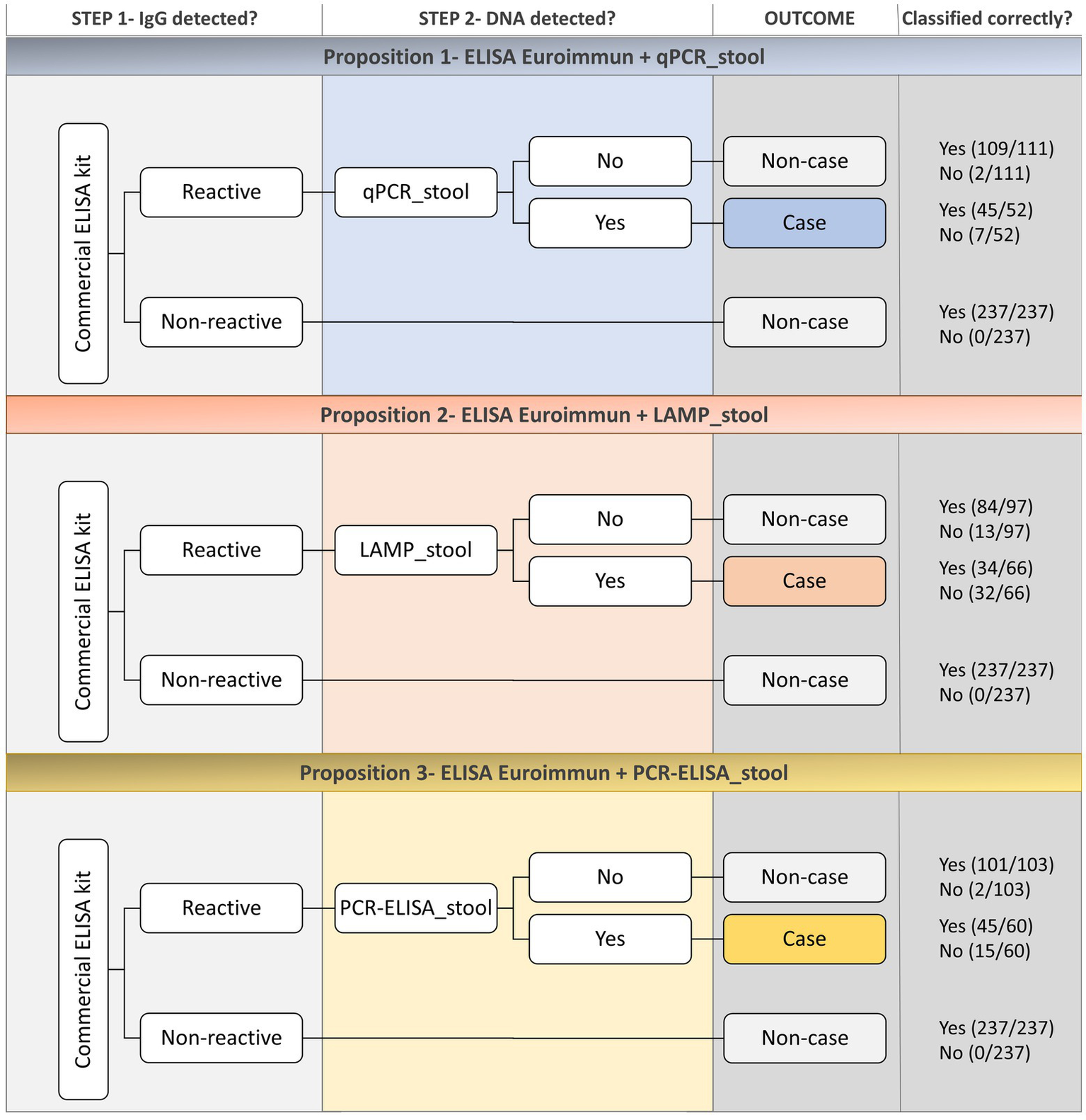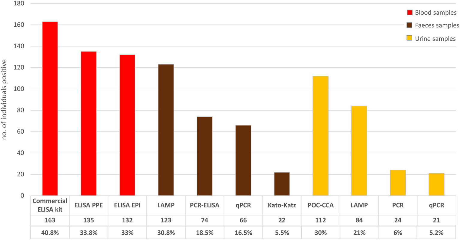 Flowchart detailing the study design. Legend: PCR-ELISA = polymerase chain reaction coupled with the enzyme-linked immunosorbent assay; qPCR = quantitative real-time PCR; LAMP = loop-mediated isothermal amplification; POC-CCA = point-of-care circulating cathodic antigens; Commercial kit = anti-Schistosoma-mansoni IgG commercial ELISA kit from Euroimmun; PPE = in-house anti-IgG ELISA test using the recombinant antigen PPE; EPI = in-house anti-IgG ELISA test using the Smp150390.1 peptide.