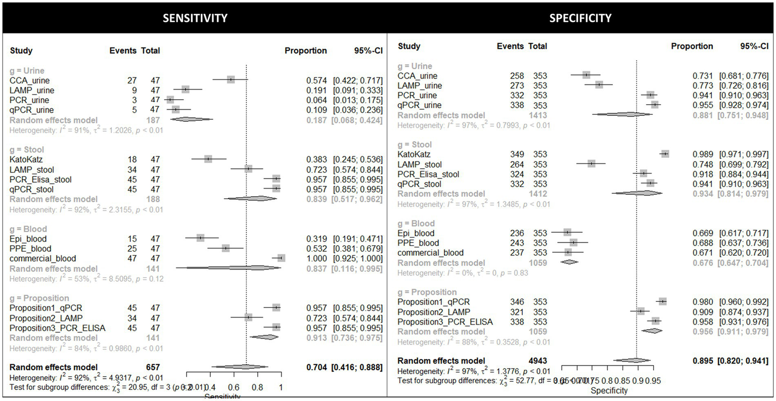 In order to calculate the summary statistics for the DTA, a pairwise meta-analysis model was selected. General pairwise meta-analysis calculates the effect size, such as relative risk and the odds ratio (OR) for binary data, and the mean difference for continuous data. DTA simultaneously combines two effect sizes, such as the sensitivity and specificity, or the positive predictive and negative predictive values. The bivariate model assumes a binomial distribution that directly models the sensitivity and specificity for within study variations, while assuming a bivariate normal distribution for between-study variation. “Different studies” were considered as different exclusive sets of tests grouped together according to the type of biological material they examined (i.e., urine, stool, or blood; Shim et al., 2019).