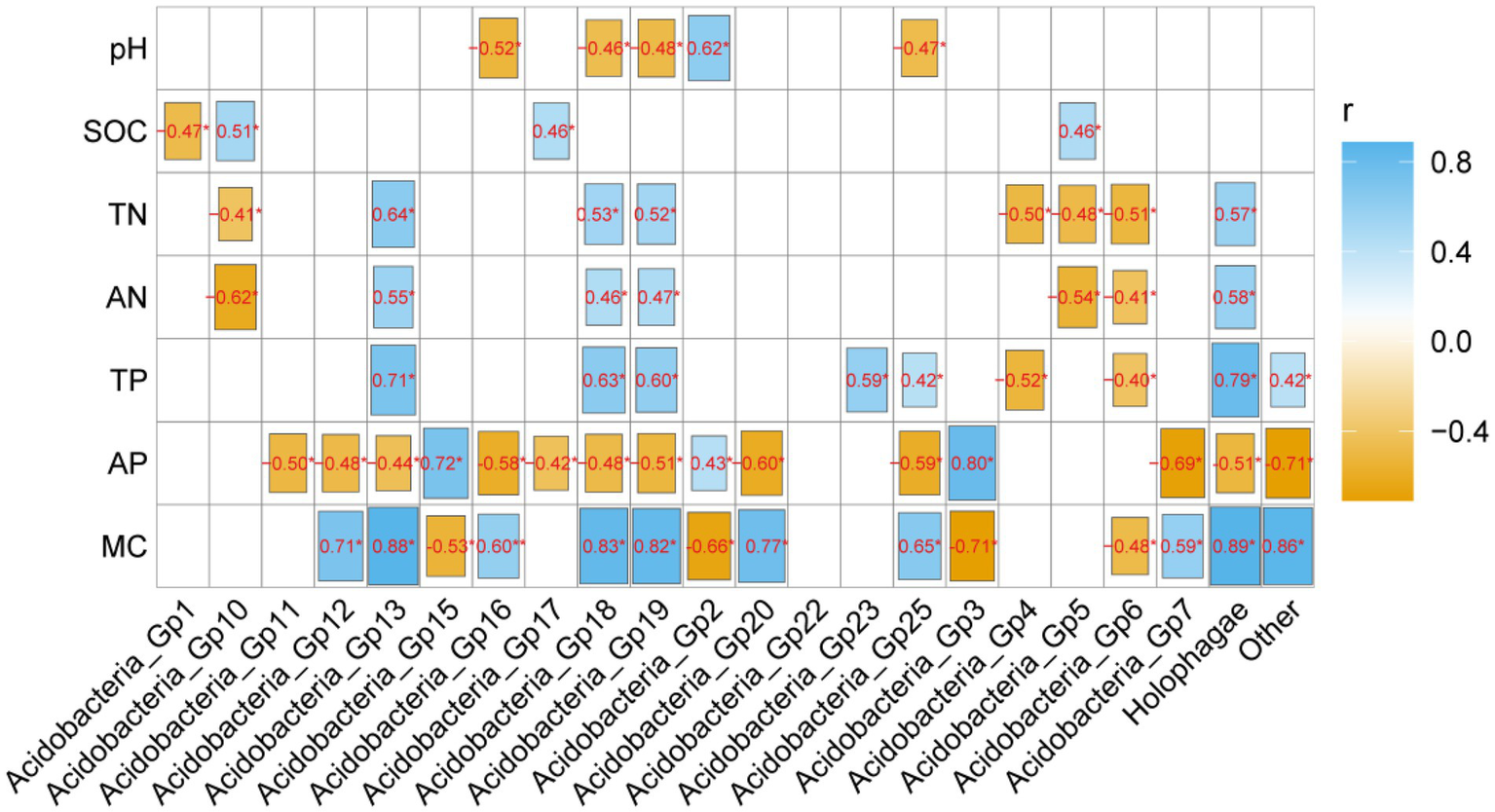 The heamap analysis showed that Gp2 and Gp3 correlated significantly positively with soil AP (p < 0.05) and significantly negatively with MC (p < 0.05) and pH (p < 0.05), but the abundant Gp6 and Gp7 had the opposite correlation with these properties (Figure 4). Gp1 was significantly negative correlated with soil pH (p < 0.05). Moreover, Gp5 and Gp 17 were significantly positively correlated with SOC (p < 0.05), but the Gp5 significantly negatively correlated with TN (p < 0.05) and AN (p < 0.05), the Gp 17 significantly negatively correlated with AP (p < 0.05). Gp4 was significantly negatively positively with TP (p < 0.05) and TN (p < 0.05). Gp13 significantly positively correlated with MC (p < 0.05), AN (p < 0.05) and TN (p < 0.05), but negatively correlated with AP (p < 0.05) (Figure 4).