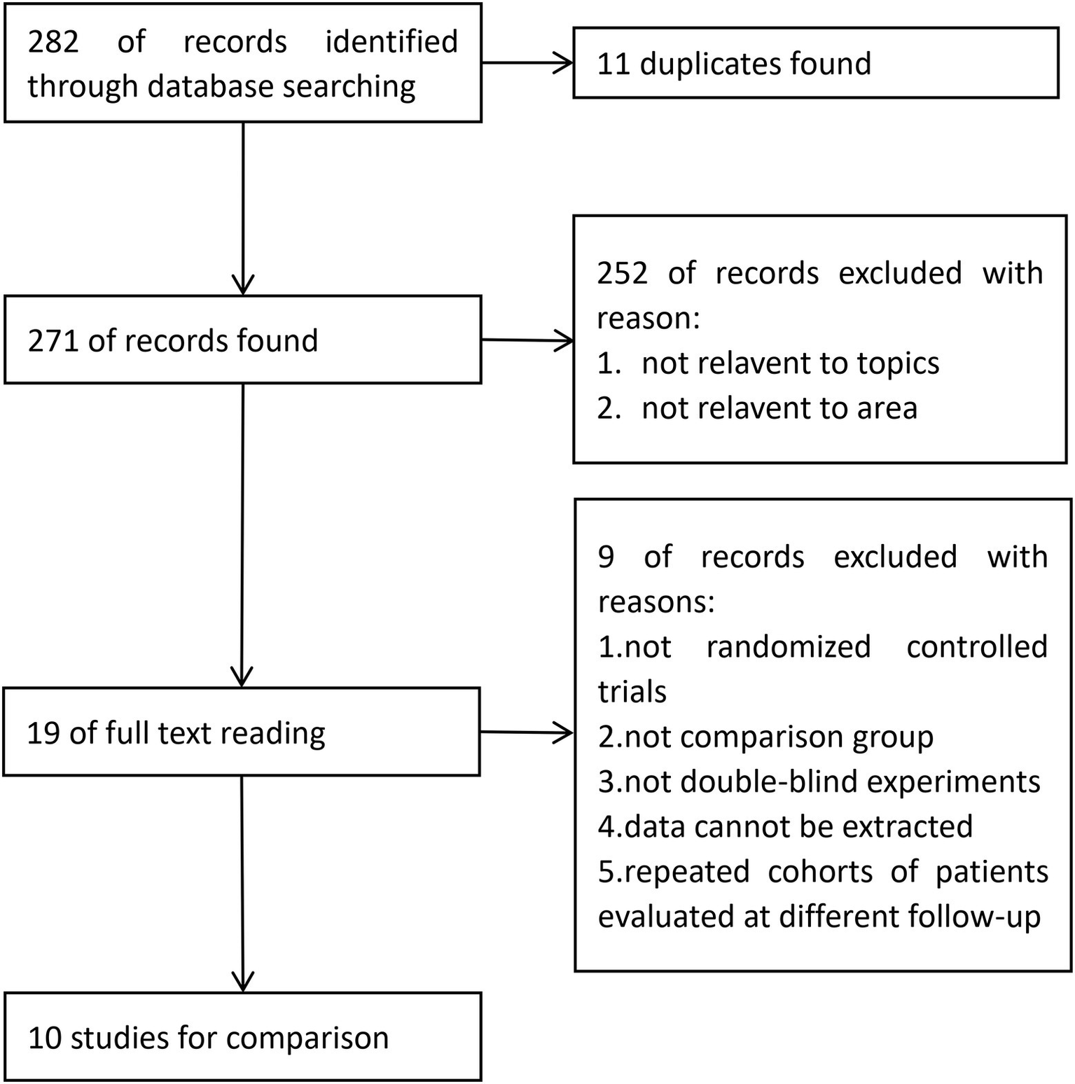 Study identification and selection was demonstrated in the flow diagram in Figure 1. From PubMed, EMBASE and the Cochrane Library, 120, 158 and 4 articles were identified, respectively. From these, 11 duplicated articles were removed, and 252 articles were then screened based on the title and abstract, most of which did not meet the inclusion criteria. A total of 19 full-text articles were considered to be eligible. Further identification excluded 9 articles due to the following reasons: not randomized controlled trials; not double-blind experiments; data unable to be extracted; no control group, repeated cohorts of patients evaluated at different follow-up times. Finally, 10 articles (Konno et al., 2010; Li et al., 2012; Konno et al., 2014; Wu et al., 2015; Zhu et al., 2017; Mikamo et al., 2019; Wei et al., 2019; Zhu et al., 2019; Qiao et al., 2020; Zhao et al., 2022) were introduced into the meta-analysis (Figure 1).