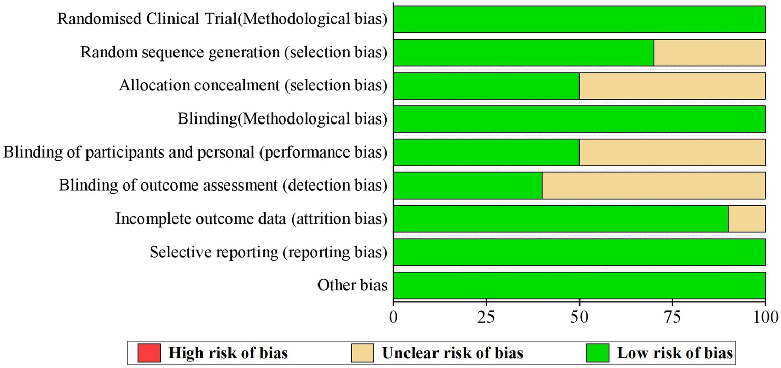 The risk of bias of all studies was assessed based on the Cochrane collaboration’s tool, which is specialized for assessing the risk of bias of randomized trials (Higgins et al., 2011). This tool consists of seven categories, i.e., random sequence generation (selection bias), allocation concealment (selection bias), blinding of participants and personnel (performance bias), blinding of outcome assessment (detection bias), incomplete outcome data (attention bias), selective reporting (reporting bias) and other bias. We used ‘low’, ‘high’ and ‘unclear’ risk of bias to categorize these included trials. Irrespective of bias risk, all screened and selected eligible studies were included in the current meta-analysis.